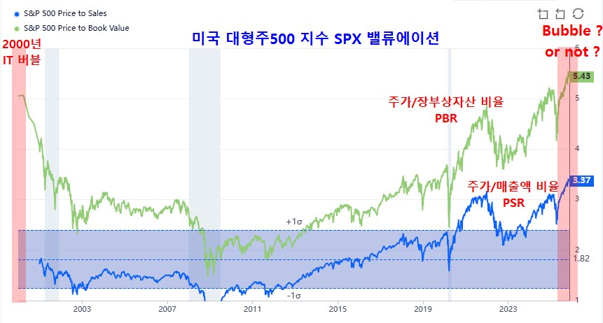 다음은 미국 대형주 500 지수(SPX) 기업들의 장부상 자산에 비교한 시가총액(주가)의 비율 PBR과 매출액에 비교한 시가총액(주가)의 비율 PSR을 나타낸 자료이다. 순이익보다 변동성이 작은 장부상 자산의 가치와 매출액을 기준으로 본 밸류에이션이다.