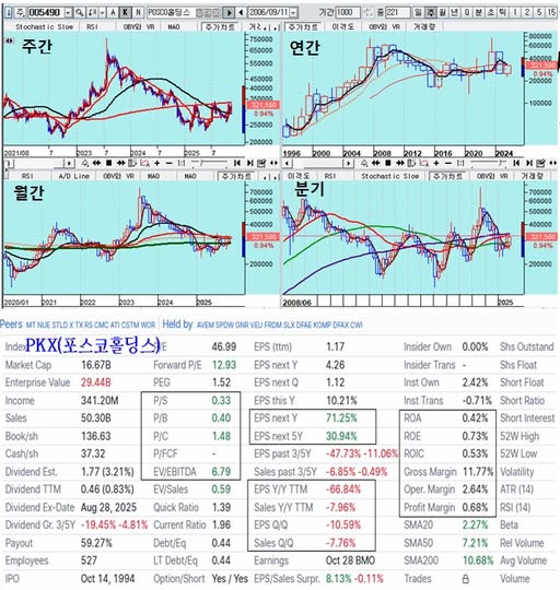 다음은 포스코의 주가와 미국 FINVIZ 사이트에서 제공하는 포스코 PKX의 펀더멘털 데이터이다.