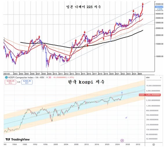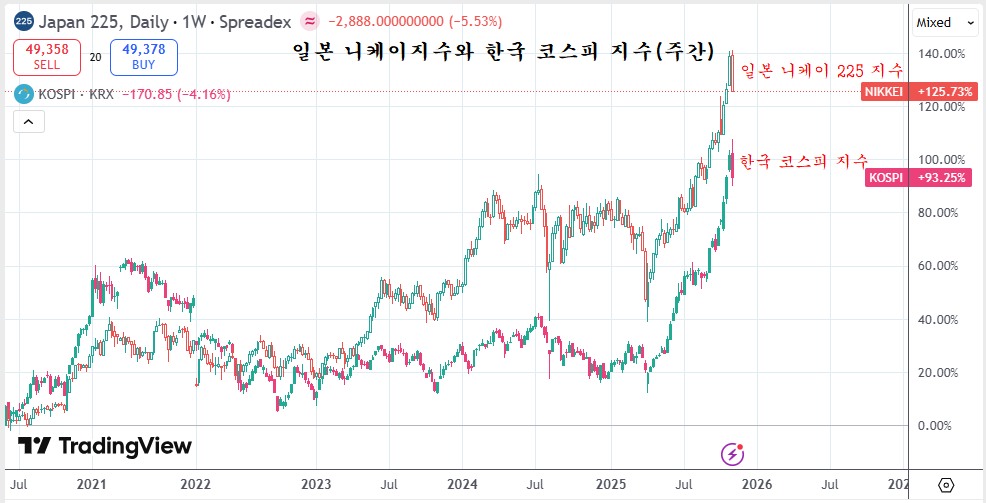 2025년 4월 이후 한국 kospi 지수와 일본 Nikkei 225 지수는 비슷한 움직임을 보이며 비슷한 상승률로 현재에 이르러 있다.
