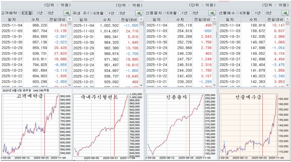 9월4일 이후 고객예탁금 증가는 20조원에 달하고, 국내주식형 펀드에 유입된 자금도 20조원으로 도합 40조원이 예탁금과 펀드로 유입되며 9월과 10월 상승의 원동력이 되었다.
