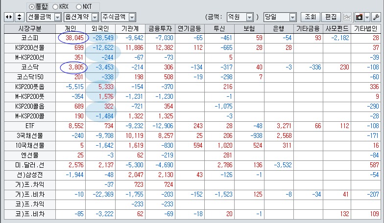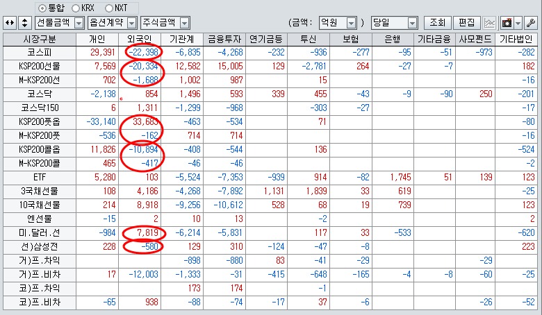 KRX, NXT 양시장에 걸쳐 2.2조원을 넘어선 현물 주식 매도, 2조원을 넘어선 선물 매도에 대규모 콜옵션 매도와 풋옵션 매수, 삼성전자의 주식 선물 매도에 이르기까지 숏포지션이 공격적으로 늘고 있다.