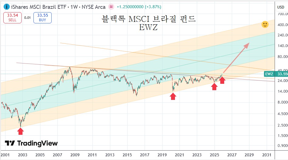 다음은 브라질 펀드 EWZ의 구조 분석 차트이다. 2008년 고점 이후 지금까지 17년에 걸쳐 주가 상단을 가로막던 저항이 돌파되어 상승이 시작되고 있다.