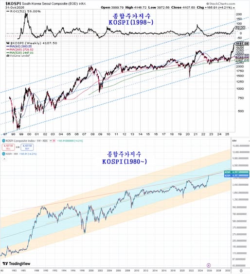 한편, 삼성전자 및 sk하이닉스 등 시가총액 상위 기업의 급등으로 지수가 크게 오른 한국. Kospi도 1980년 이후 45년 대세 채널의 중심을 넘어 선 모습이나, 연봉 과이격 상태로 1989년, 2007년을 잇는 저항에 접해 있어 일본 증시와 함께 조정을 거칠 가능성이 커지고 있다.