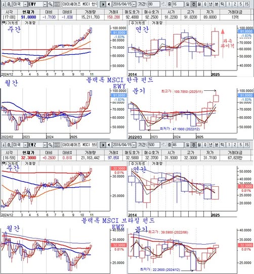 단기간에 급히 올라 이격 과열을 보이며 조정을 준비하는 한국펀드 ewy 대신 상당기간은 브라질 펀드에 투자를 해두면 좋을 것이다.