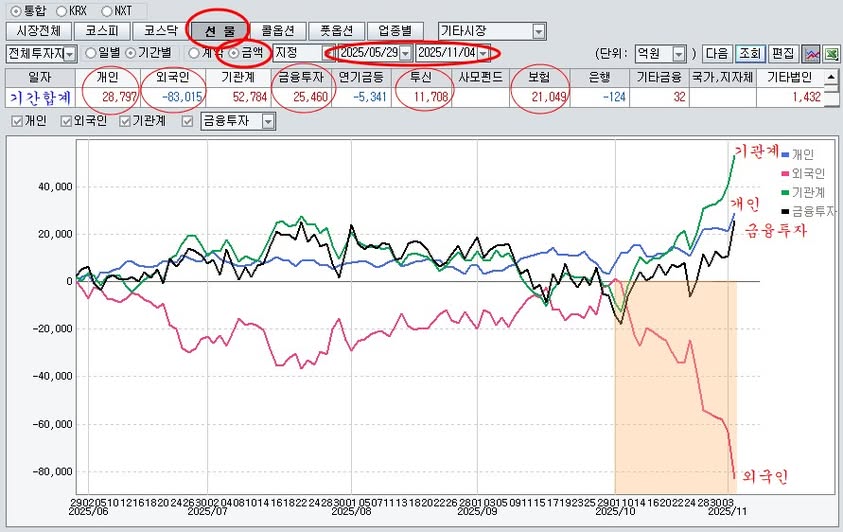 이격 과열로 끝난 10월 이후 11월 첫거래일은 특히 개인의 반도체 인공지능 첨단기술 ETF 투기적 유입으로 급등 마감했지만, 둘째날인 오늘은 외국인의 매매 방향이 하락에서 이익을 얻는 숏 포지션 일방향이다.