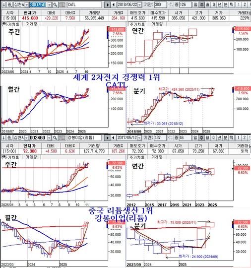 2차전지 부문에서 세계 1위 기업은 중국의 CATL이고, 리튬에서 가장 경쟁력이 강한 기업은 강봉이업(리튬)이다. 국내 기업에서 2차전지를 찾기 보다는 세계 경쟁력 1위의 기업을 찾아 지분(equity)를 늘려 가라.