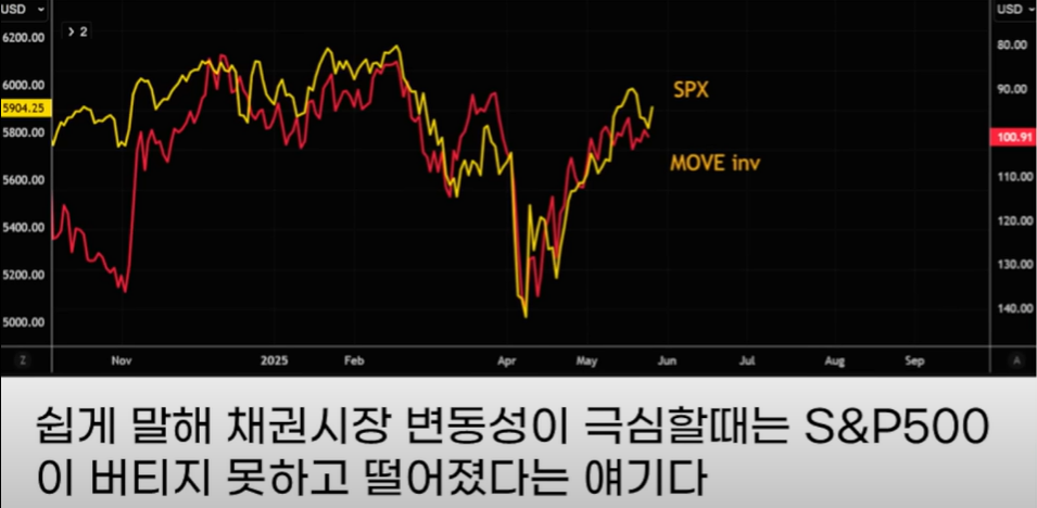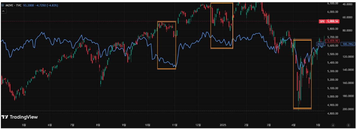 채권 시장 변동성이 낮아질수록 spx(주식 시장)가 함께 상승하는 것을 확인할 수 있다.