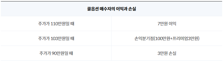 콜옵션 매수자 김민재씨는 A주식이 상승할 것이라는 가설을 바탕으로 한달 뒤 100만원에 주식을 살 수 있는 권리를 매수했다. 한달 뒤, A주식이 주가가 110만원으로 상승했을 때 김민재씨는 옵션계약을 맺을 때 지불한 프리미엄 3만원을 제한 7만원을 수익으로 가져간다.