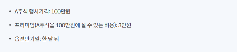한달 뒤 주가가 90만원으로 떨어진다면 김민재씨는 100만원에 주식을 '살 수 있는 권리' 를 포기하여 옵션 계약 당시 지불한 3만원의 프리미엄만 손실로 확정한다.
