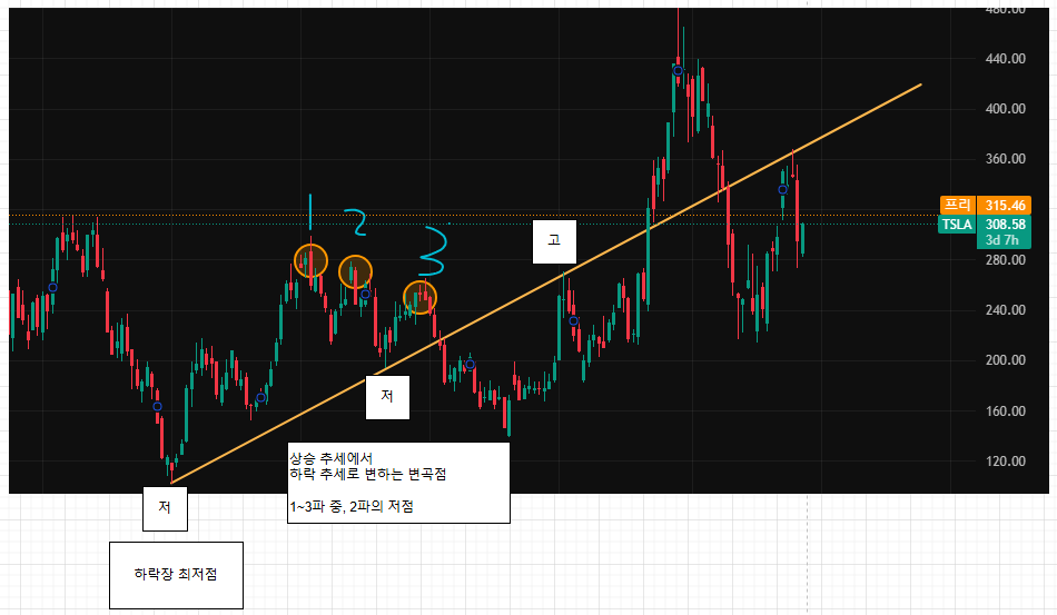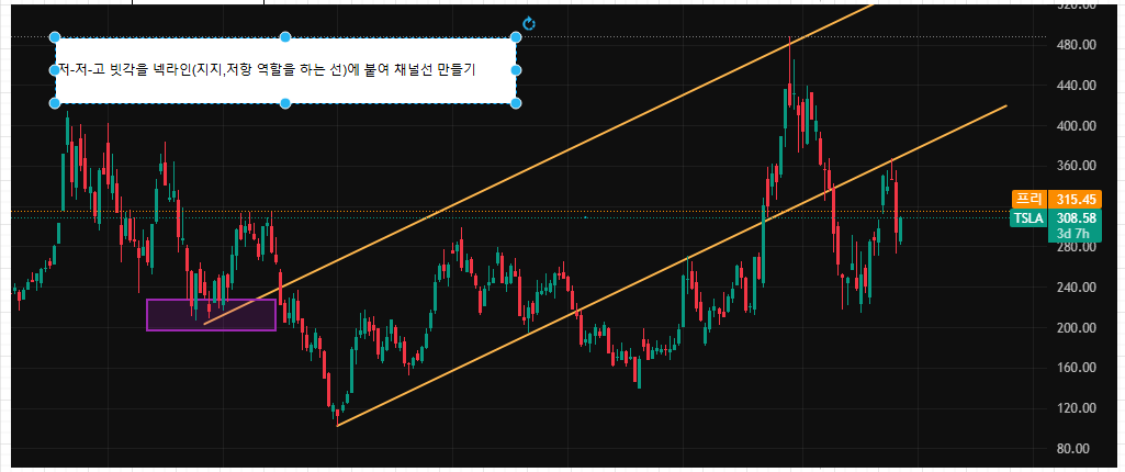 의미있는 저점과 변곡점(상승에서 하락 전환 or 하락에서 상승 전환)을 이어, 해당 추세선에 닿는 고점을 의미있는 자리로 본다.