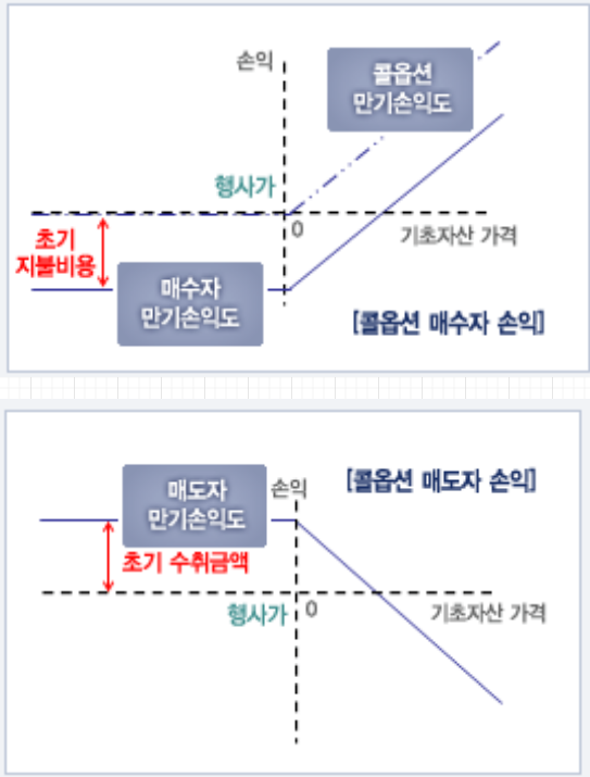 가령, 현재 가격이 7만원인 기초 자산이 있다고 가정하자. 해당 기초 자산이 만기일에 8만원 이상으로 상승할 것으로 생각하는 매수자 민재가 있다. 민재는 옵션 시장에서 행사가 8만원인 콜옵션을 프리미엄을 지불하고 매수했다. 만약 만기일에 자산 가격이 7만 5천원...등등 8만원 미만일 경우에는 민재 입장에서 옵션을 행사할 권리를 포기(=프리미엄 만큼의 손실)하게 되고 이는 곧 콜옵션 매도자의 수익이 된다. 반대로, 만기일에 자산 가격이 8만원 이상으로 오르는 경우에는 상승분 만큼의 수익을 가져가게 되고 매도자의 손실은 무한히 커지게 된다.