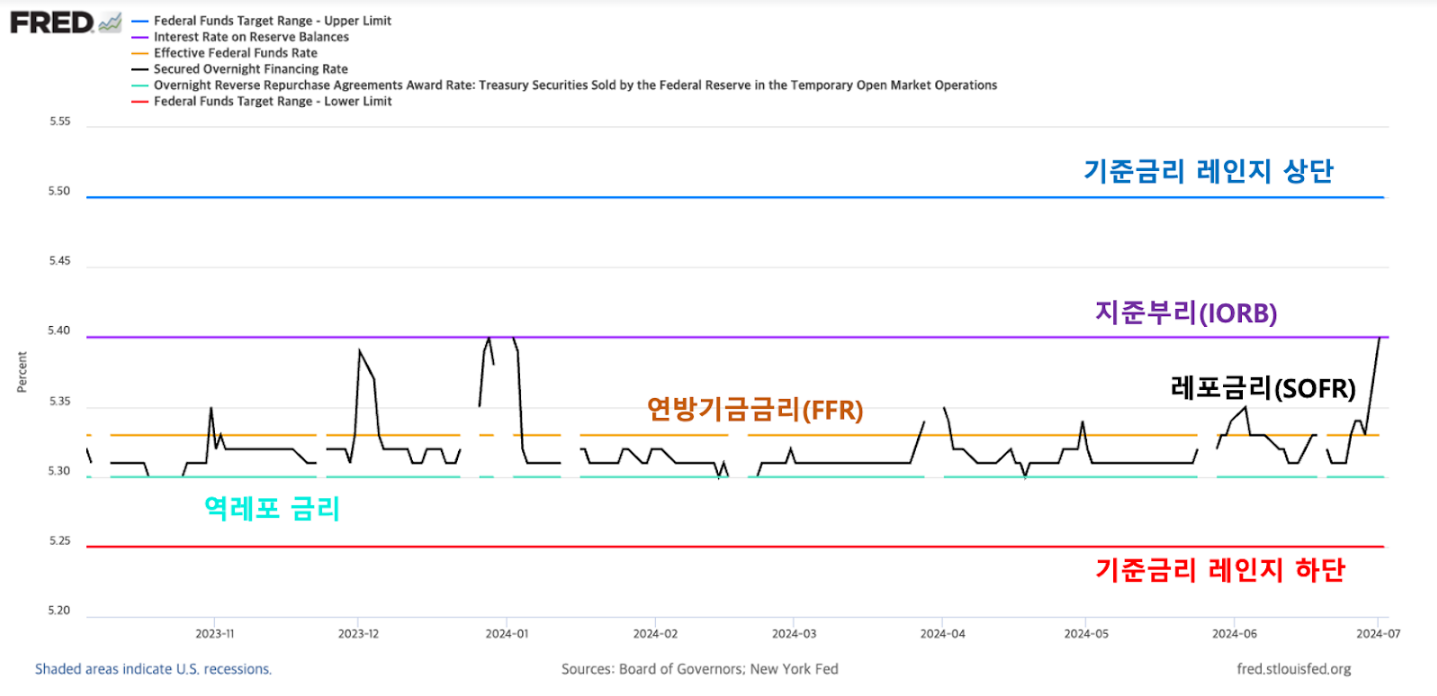 이들은 은행과 달리 연준의 지준금 계좌에 직접 자금을 예치할 수 없기 때문에, 시중에 IORB보다 낮은 금리로 자금을 대출할 유인을 갖게 되는데요.