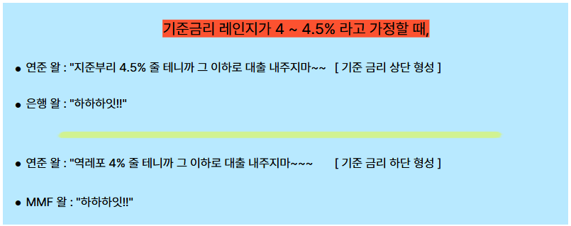 ➡️"연준 지준금 계좌에 돈 넣으면 4.5% 이자 준다는데 너거들은 신용도 더 좋은 것도 아닌데 우리가 당연히 4.5% 이상으로 빌려주는 게 맞지 않냐???"