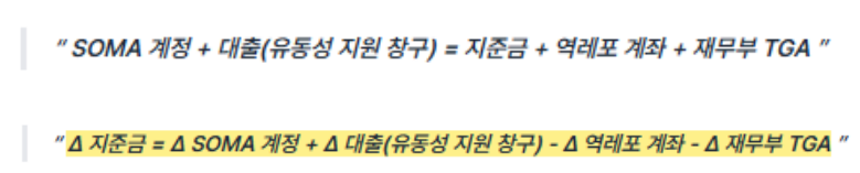 ➡️연준이 양적 완화를 진행하면 연준의 보유 증권이 증가하며 SOMA 계정이 증가 + 연준이 시중에 대출을 진행 = 은행 지준금 상승