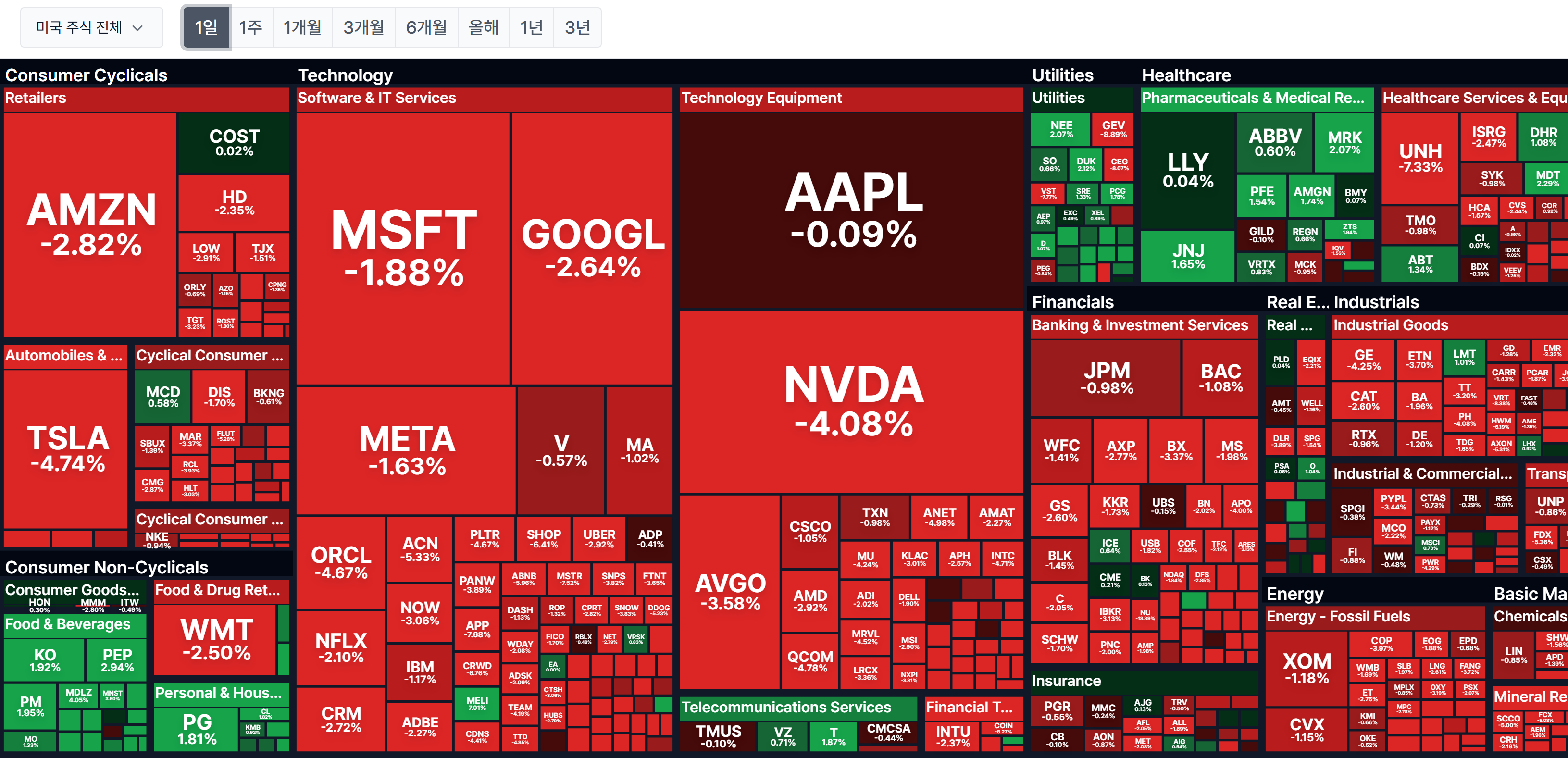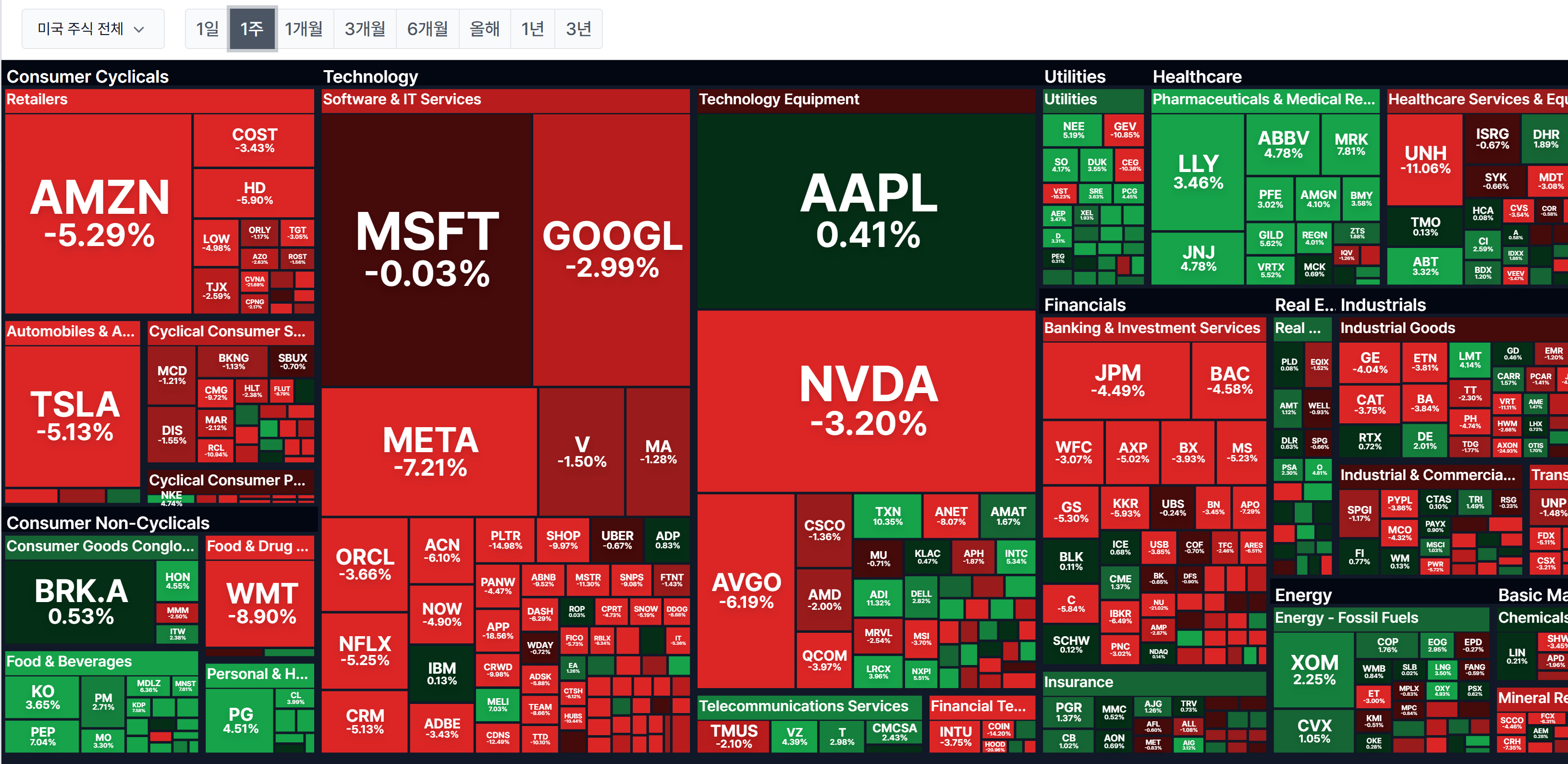 1일과 1주일 섹터 히트맵 입니다. 산업과 에너지를 제외하면 하락섹터가 비슷 합니다. 어제 하루만의 흐름이 아니라 두 섹터를 제외하면 지속적인 흐름이였습니다.