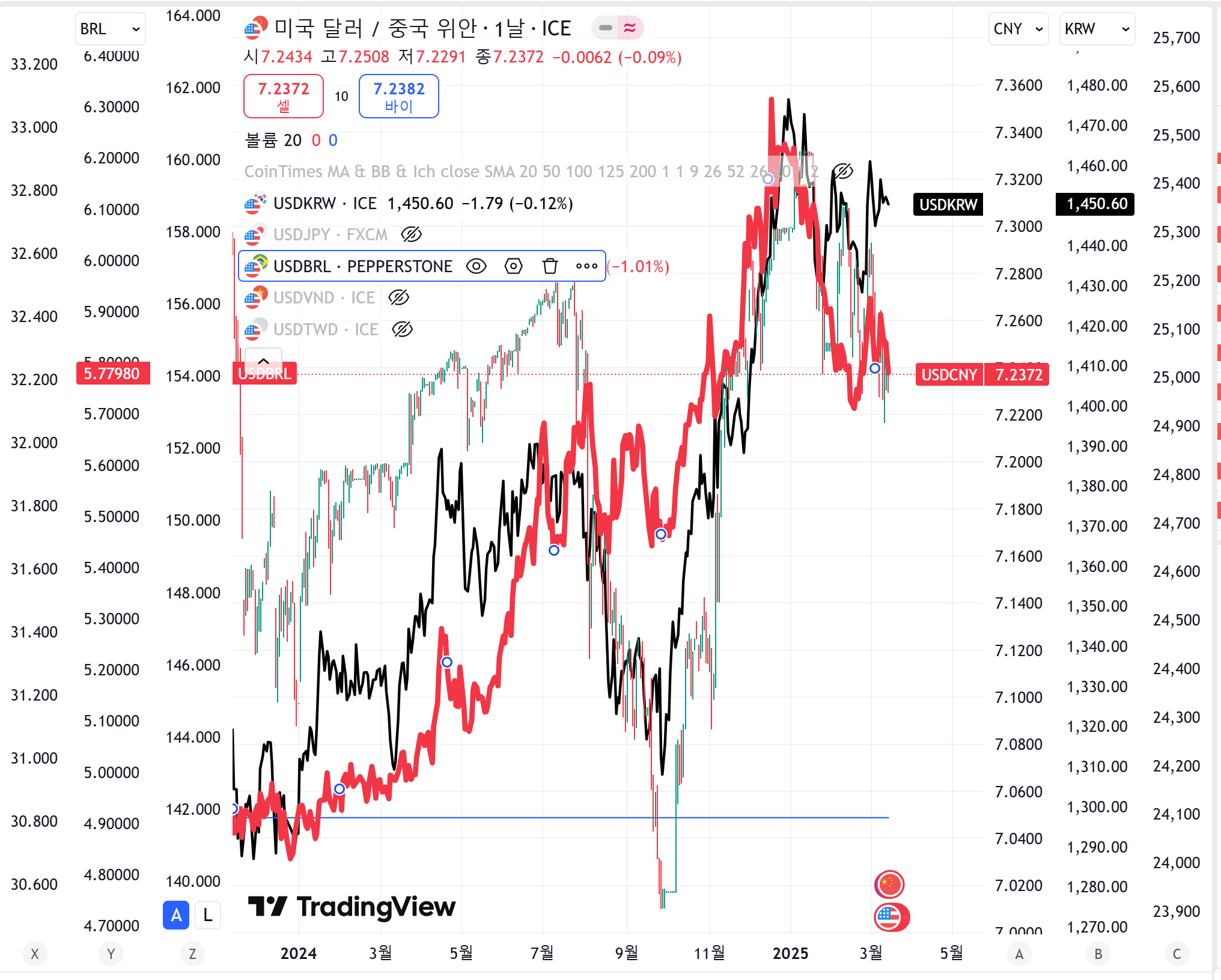 원화의 최근 움직임은 TWD(대만),VND(베트남)과 유사하게 움직인다.원화는 중국위안 프록시 인줄 알았는데 그 수준도 안되나? 정치적 불확실성이 걷히고 나서도 이러면 한국의 체질이 변했다고 생각해야 하나 고민이다.오히려 중국 프록시인건 브라질 해알이였다. 브라질은 선거를 앞둬서 정치적 혼란이 극심하지만 중국위안의 프록시인 상태중국이 내수부양을 하면 브라질은 자동으로 경기가 힘이 좋아지는게 정치적 혼란보다 더 큰 영향을 주는듯회원가입만 해도이 글을 무료로 읽을 수 있어요.회원가입이미 계정이 있으신가요?로그인하기6