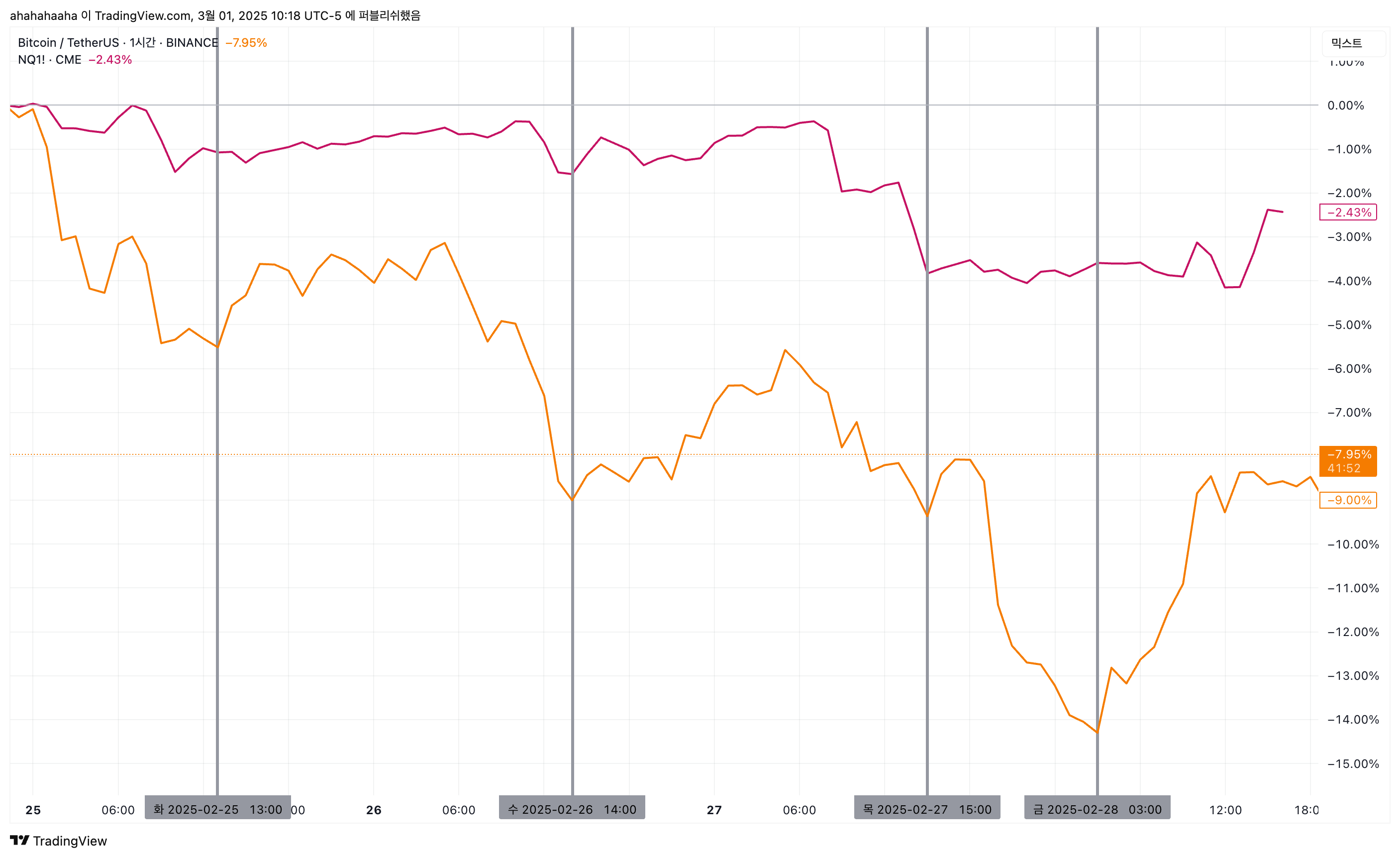 비트코인(주황색) vs 나스닥 선물(자주색) - 뉴욕시간