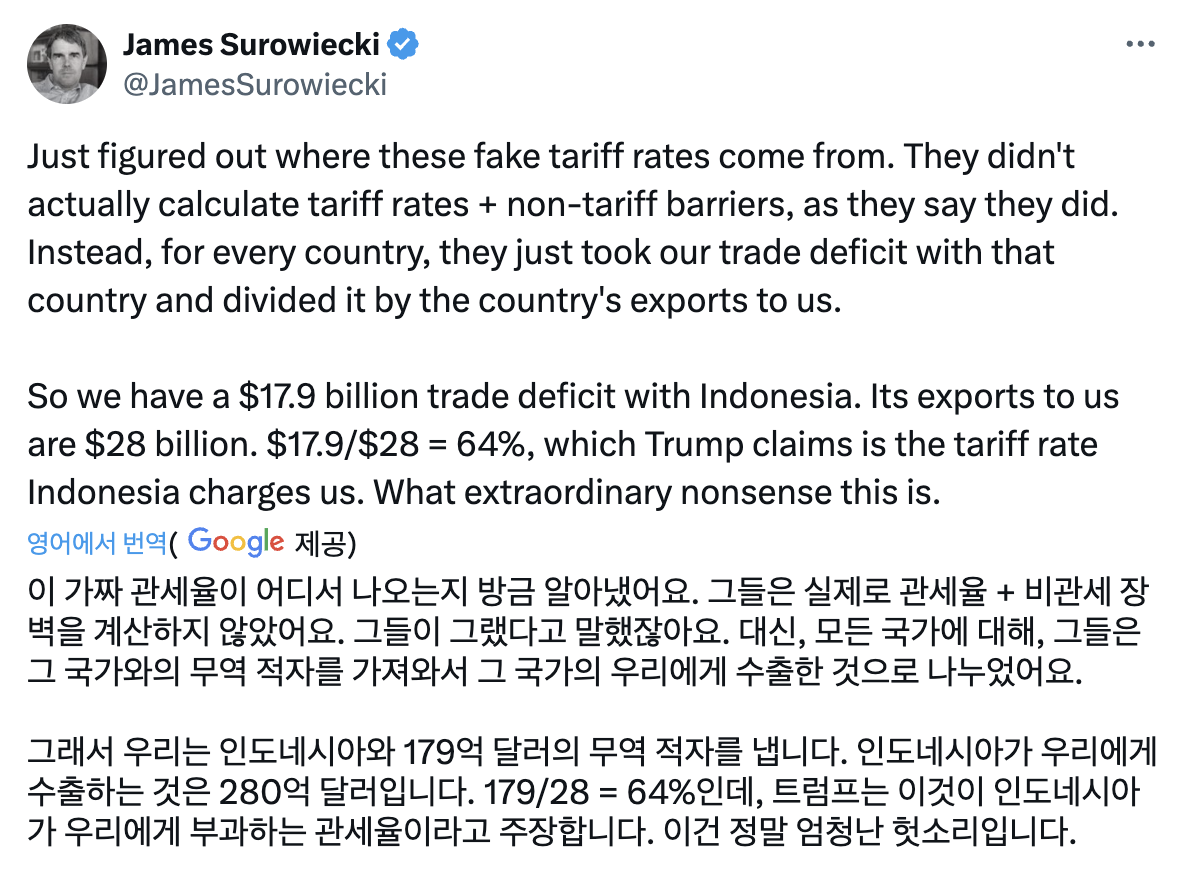 ChatGPT에 "무역적자에 있어서 미국이 공평한 경쟁을 할 수 있도록 다른 국가에 부과해야할 관세를 계산하세요. 최소 관세는 10%입니다."라는 프롬프트를 넣으면 오늘 발표된 관세와 유사한 결과가 나온다는 것인데요.