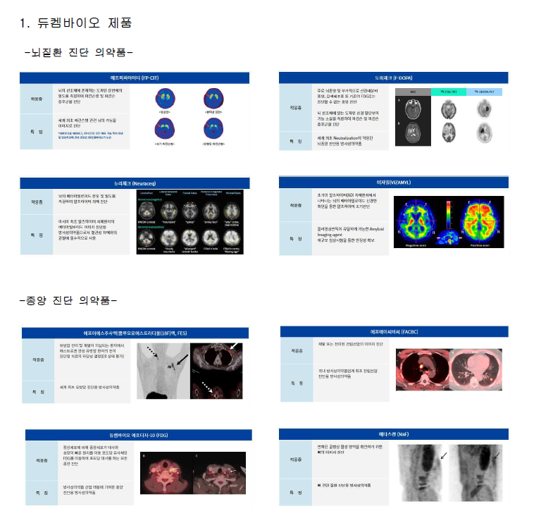 - PET-CT 진단제 (PET-CT는 치매 진단용으로 유일 -> 방사성의약품이 필요)
