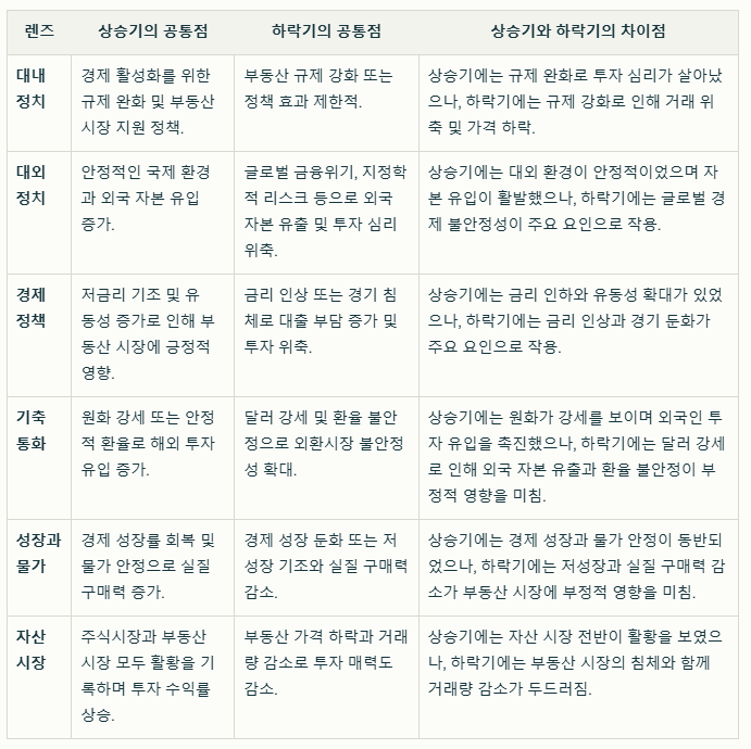 현재 한국 주택가격은 2022년부터 지속적으로 하락하고 있으나, 서울만큼은 2023년 하반기부터는 상승으로 전환되었고, 2024년 1분기에만 잠깐 하락세로 돌아서다가 2분기부터 지금까지는 계속 상승하였다. 과거 한국의 서울아파트는 물가상승률 제외한 실질 상승률을 따져 보았을 때, 단기적 상승과 하락을 제외하고는 큰 추세로 보면 1998년 6월부터 2006년 11월까지 상승하고, 2006년 11월부터 2013년 1월까지는 하락하였다. 그 후, 2013년 1월부터 2021년 10월까지는 상승하였고 2021년 10월부터 현재까지 하락하고 있다고 볼 수 있겠으나, 일부 서울 지역인 마포구, 용산구, 서초구, 강남구, 송파구 등에서는 신고점을 돌파하는 듯 양극화된 흐름을 보이고 있다. 단순히 과거 1998년 6월부터 2006년 11월까지 상승하고, 2006년 11월부터 2013년 1월까지는 하락한 싸이클이 반복된다면 2021년 10월 이후 부터 약 7~8년간 하락한다고 볼 수 있겠다. 하지만 나는 이에 대하여 귀납적 추론이 아니라, "6가지의 측면 : 1. 대내 정치의 렌즈, 2. 대외 정치의 렌즈, 3. 경제 정책의 렌즈, 4. 기축 통화의 렌즈, 5. 성장과 물가의 렌즈, 금리, 6. 자산 시장의 렌즈" 표로 6가지 측면으로 비교해 가며 연역적 추론을 하고자 한다. 표로 서울 아파트 상승기였던 1998~2006년과 2013년~2021년을 비교해주기 바라며 마찬가지로 서울 아파트 하락기였던 2007년~2012년을 2022년~2024년까지와 2025년~2027년까지의 전망을 위에 언급한 6가지 렌즈로 각각 추론하고 종합결론을 내려주기 바란다. 아울러 지금은 인구가 감소하고 있지만 가구수는 늘어나고 있으므로 이를 같이 고려해주기 바라며, 일본, 스페인, 독일 등 한국보다 이미 인구감소가 먼저 진행되고 있거나 가구수의 변화에 따라 주택가격이 변화했던 사례나 논문이 있다면 같이 참고해주기 바란다. 특히 인구나 가구수 변화에 따른 일본의 도쿄와 그 외 지역에 대한 지역별 양극화 문제를 꼭 다뤄주기 바란다. 위에 언급한 6개의 렌즈와, 인구통계적 관점, 그리고 단순히 인구통계뿐만 아니라 인구가 줄어도 핵가족화로 인해 가구수가 늘어날 수도 있다는 점까지 고려하여 추론해달라.
