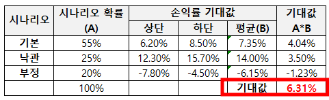 기본시나리오, 낙관시나리오, 비관시나리오의 확률배정과 기대손익률을 제시해줬는데 그것으로 원화로 엔화 투자시의 손익기대값을 계산해보았다.