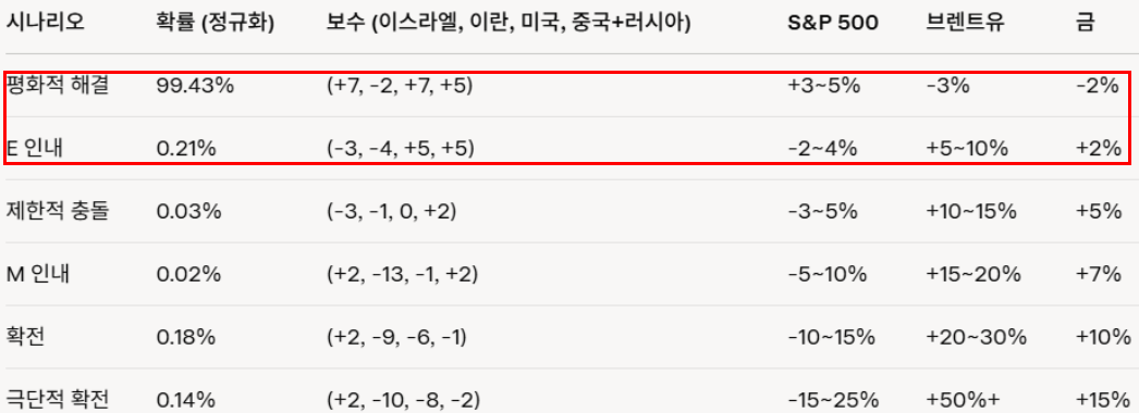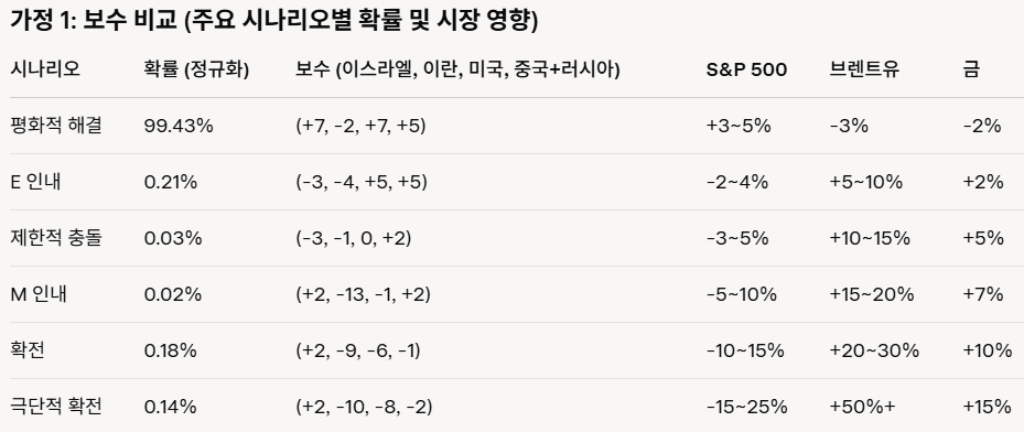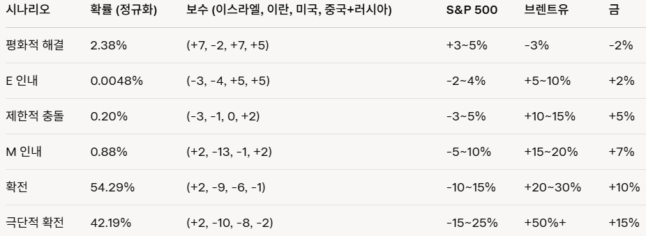 이번엔 확전 및 극단적 확전 시나리오가 96%까지 튀어버립니다. 확률의 정규화 과정을 거치기 전, 즉 12가지 시나리오 기준으로도 확전 및 극단적 확전, 그리고 그 변형 시나리오의 총 확률은 88.47%입니다.