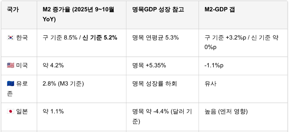 2025년 1~3분기만 봐도 한국은 +2.2%p로 상승한 반면, 일본(-5.7%p), 유로존(-2.0%p), 미국(-0.4%p)은 모두 하락했습니다. 주요국 M2 증가율 비교도 이 방향성을 확인해 줍니다.
