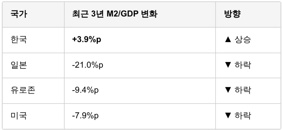 더 주목해야 할 것은 방향성입니다. 최근 3년간 주요국이 양적긴축(QT)을 거치며 일제히 M2/GDP 비율을 낮추는 동안, 한국만 역주행했습니다.