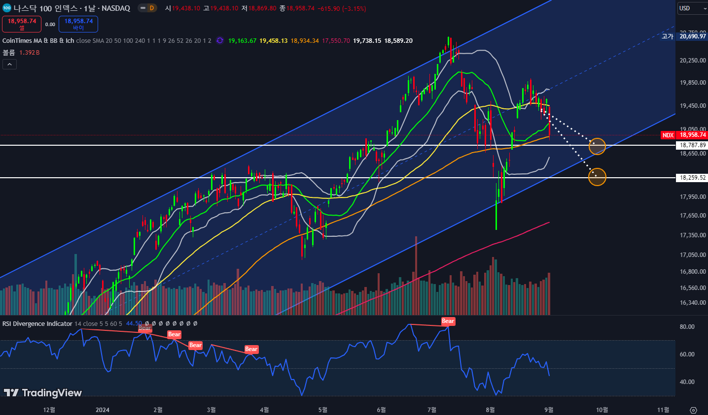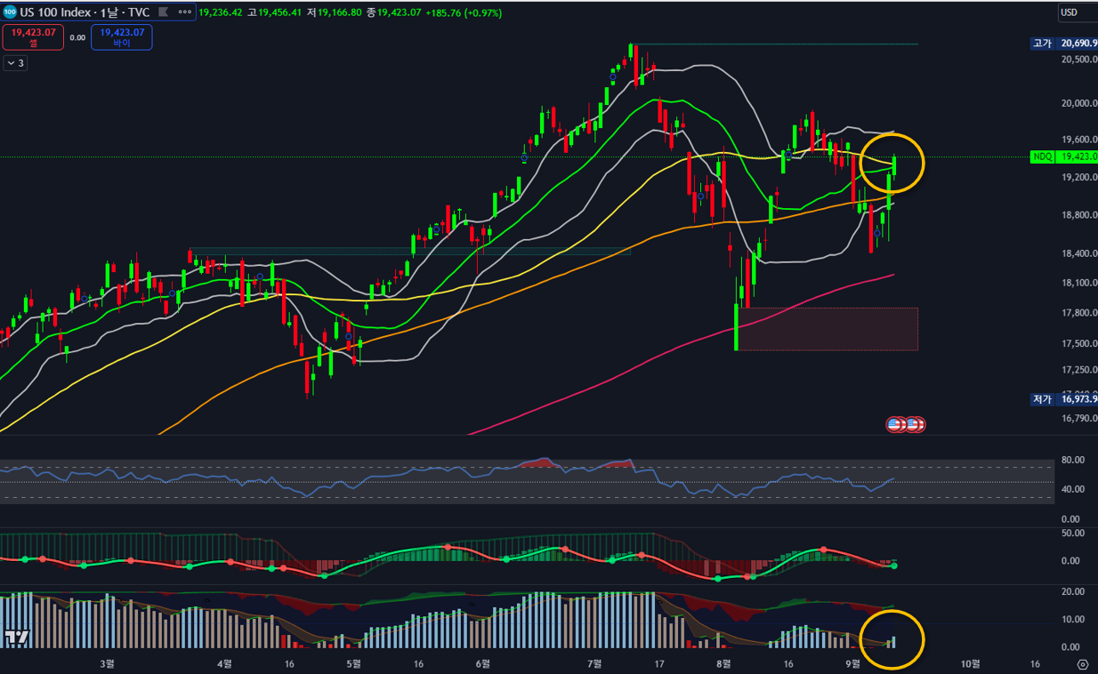 나스닥100이 주요 저항선 모두 뚫었다. 이제 상방으로 19900까지 열려있다.