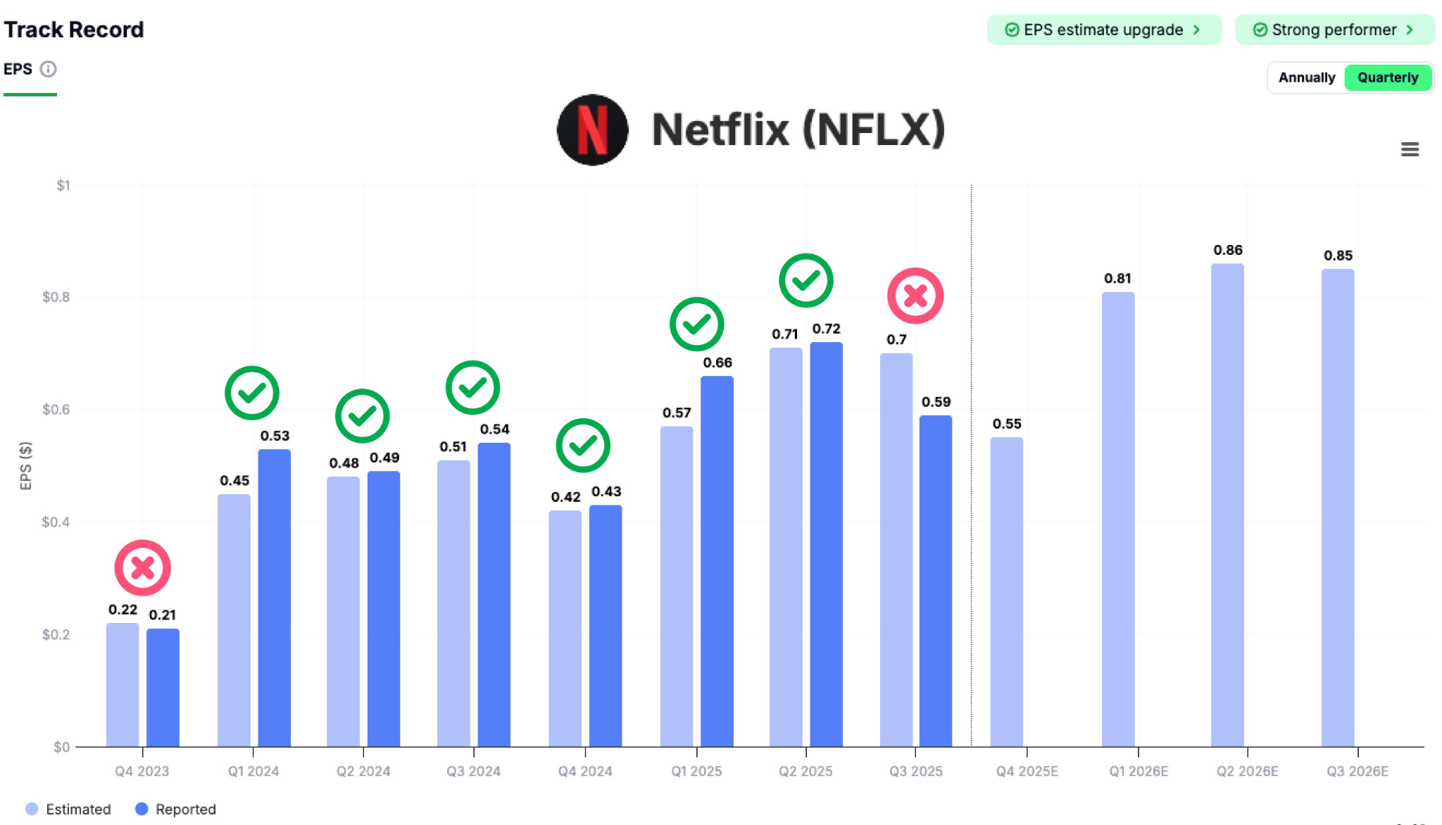 과거 기록은 어닝 서프라이즈 6번, 어닝 미스 2번. 2/3 확률.