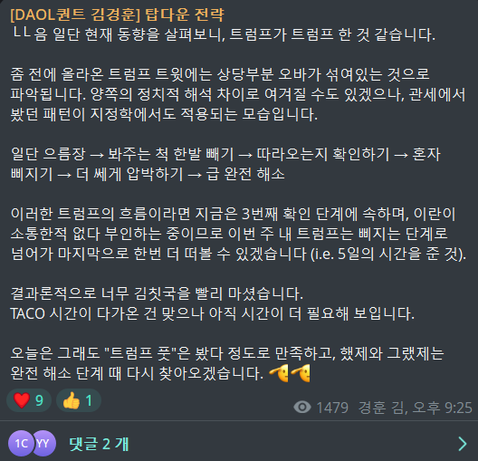 어제 트럼프와 이란 대통령의 전쟁 종료 관련 발언으로 대폭등 했습니다.