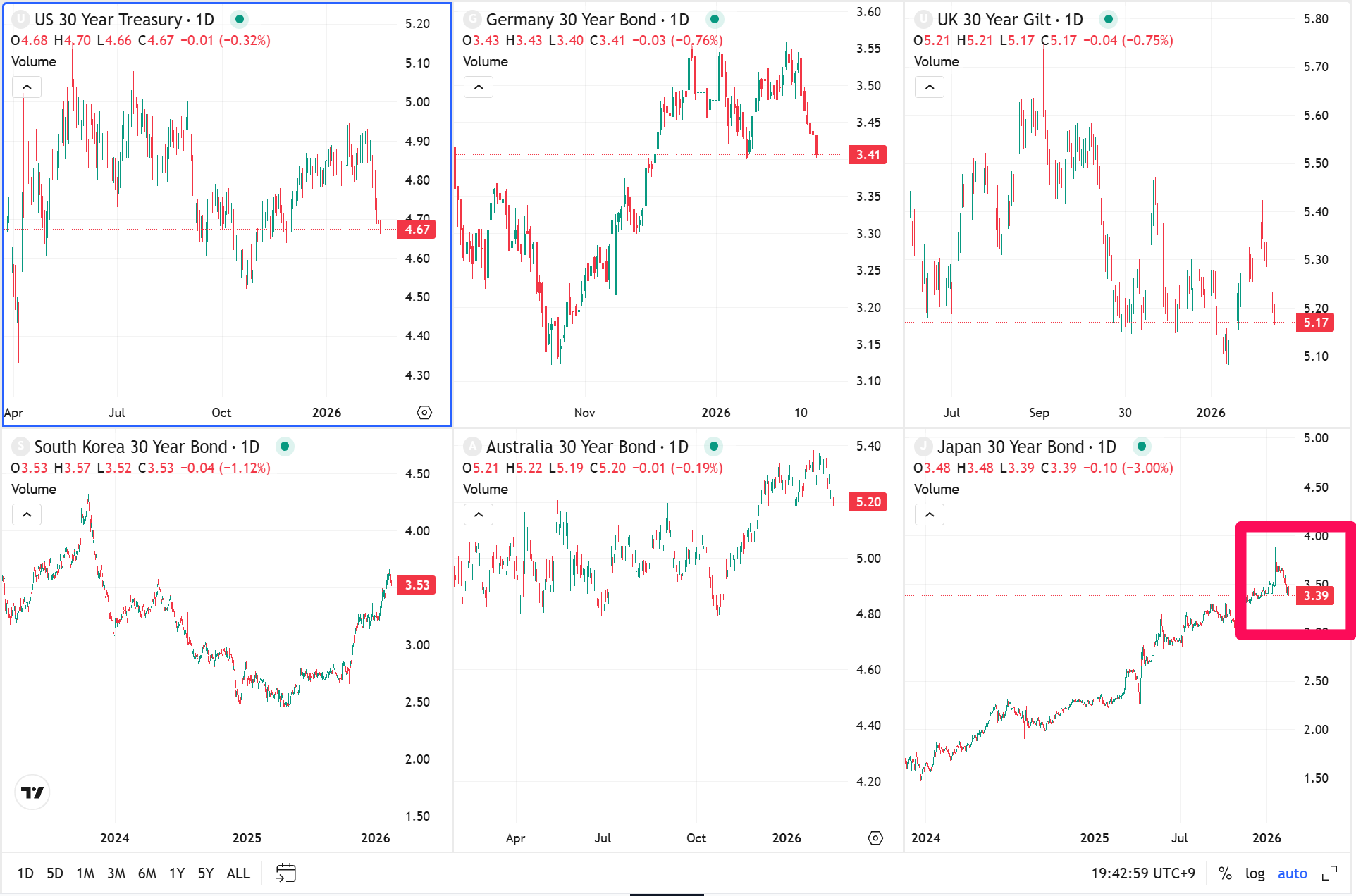 지난주(2월 9일 ~ 2월 13일) 시장 금리는 저의 예상과 완전히 다른 방향으로 진행되었습니다. 다카이치가 중의원 선거에서 압승을 거둔 이후 일본 장기금리가 상승할 줄 알았는데, 예상과 달리 하락세로 전환되었습니다. 일본 장기금리가 선진국 장기금리 상승세를 주도했었는지, 주요 선진국의 장기금리가 모두 하락세로 전환되었고, 미국과 한국도 예외가 아니었습니다.