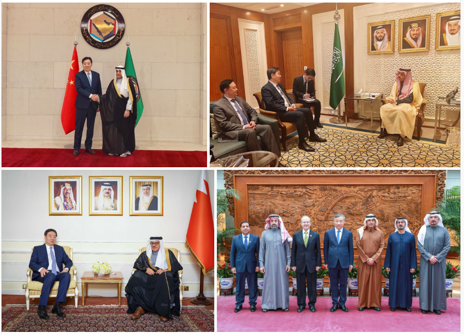 2026년 3월 8~12일, 자이준 중국 중동특사의 걸프 순방. GCC 사무총장 알부다이위와 악수(좌상), 사우디 외교장관 파이살과 회담(우상), 바레인 외교장관 알자야니와 회담(좌하), UAE 대통령 특사단과 단체 회동(우하).