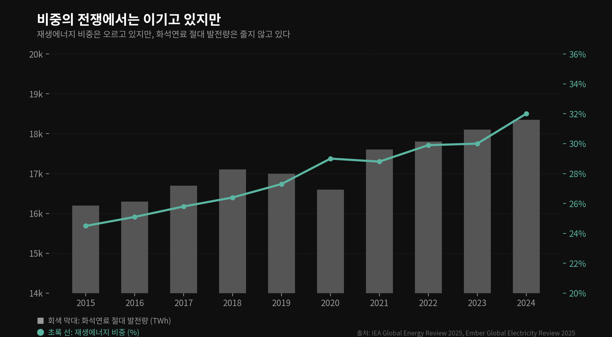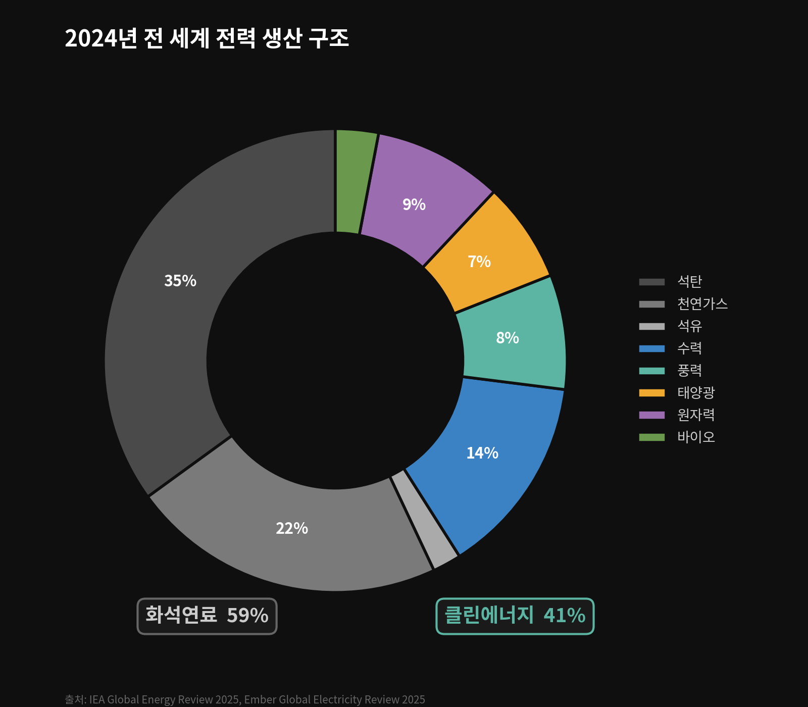 2024년 기준, 전 세계 전력 생산의 구조는 여전히 화석연료가 지배하고 있다.