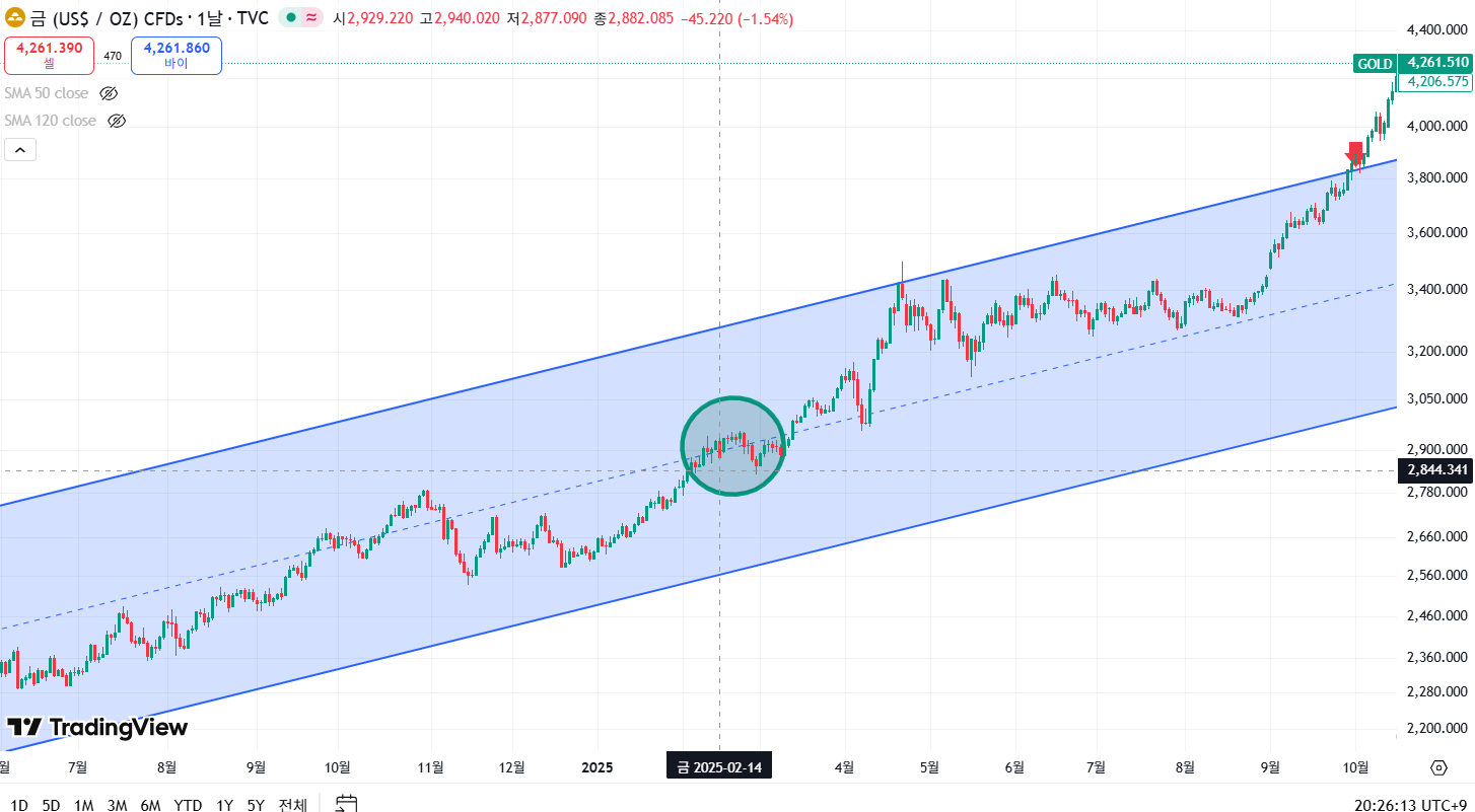 해당 날짜를 아래의 국제 금 가격에서 보면 아래의 초록색 원 구간에 해당합니다.