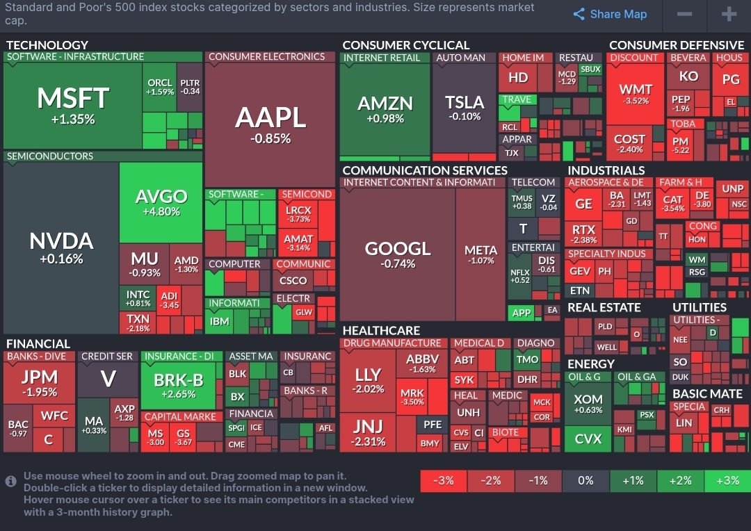 이에 따라 증시는 좋른 실적의 브로드컴, 최근 ai로 많이 빠졌던 sw 주식들과 정유주를 제외하곤 전치적으로 하락했습니다.