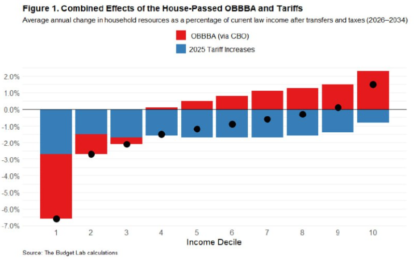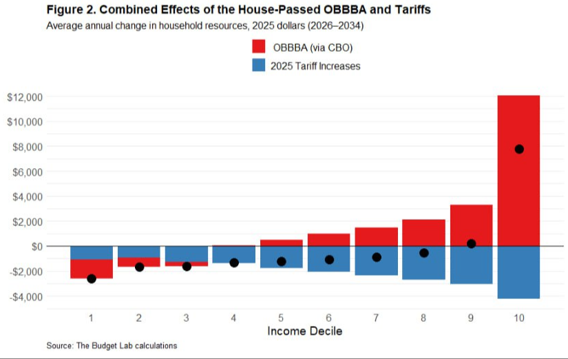 The Budget Labs와 CBO 데이터에 따르면, 이번 트럼프 2기 행정부의 세금 혜택(OBBBA, TCJA 등)에서 가장 집중적으로 받은 계층이 바로 여기다. 이들은 오히려 세후/실질소득이 대폭 늘어났다.