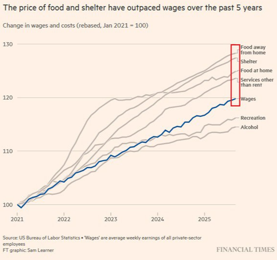 2021년 이후 2025년 지금까지 올라간 외식 가격과 주거비용은 각각 임금 대비 27~8%까지 상승한 상황이다.