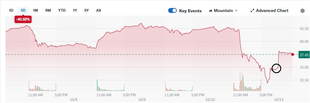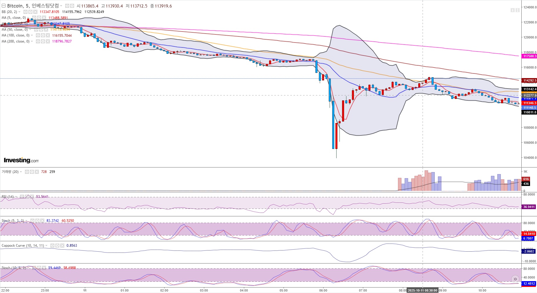- 결정적인 것은 오전 7시가 조금 넘어서 트럼프가 "그래도 APEC 갈 것 시진핑과 정상회담 할 수도"라는 발언을 하며 입장을 바꾼 것이었음. 그 얘기를 듣자마자 시장은 위로 꿈틀대었고, 그 순간 이 조정은 아주 빠르게 어쩌면 하루 짜리로 끝날 수도 있겠다는 생각이 들어서 매수 가능한 현금 100%를 동원함.