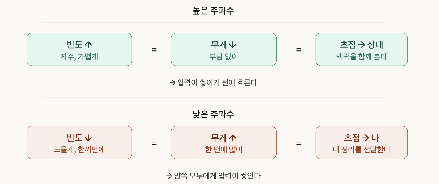빈도가 높으면 한 번에 담을 내용이 적어지니 메시지가 가벼워지고, 가벼우니까 상대의 맥락까지 살필 여유가 생깁니다.