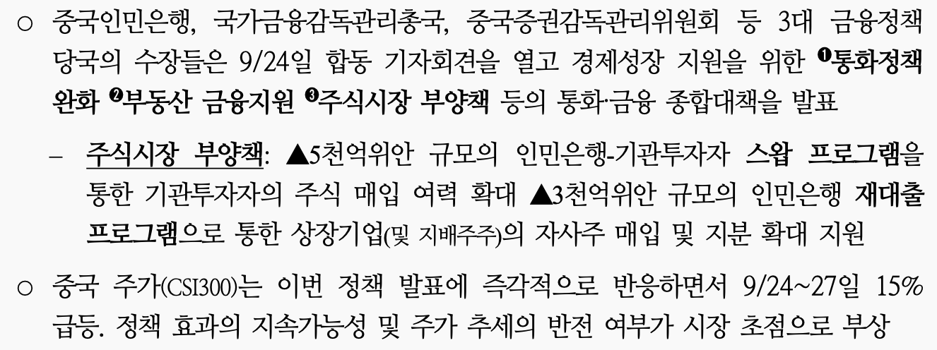 인민은행(중앙은행) 이 명시적으로 주가를 부양하는 중국의 첫 사례이기 때문임. 과거에는 당국이 주체가 된 것도 있고 다소 미시적인 형태의 주가부양 대책과 본질적으로 달랐음. 2015년도에 주가가 급락했을 때 정부 유관 기관들이 주식 매입에 있어 인민은행이 배후에서 지원한 적은 있음. 근데, 이번처럼 주가 부양에 전면에 나서서 지원 규모와 수단을 '직접적으로' 명시한 건 처음이기 때문임.