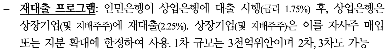 중앙 은행이 일단 상업은행(우리로 따지면 한국은행이 신한, kb, 우리 은행 에게)에게 대출을 해주고. 상업 은행이 상장 기업들한테 2.25% 금리로 대출을 해줌. 그리고 지분 확대나, 자사주 매입으로'만' 쓰게 함으로써. 주가 부양을 명시적으로 시키는 거임.