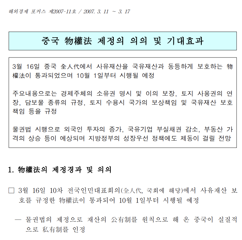 한국은행 - 중국의 물권법 제정의 의의 및 기대효과 (2007년 자료)