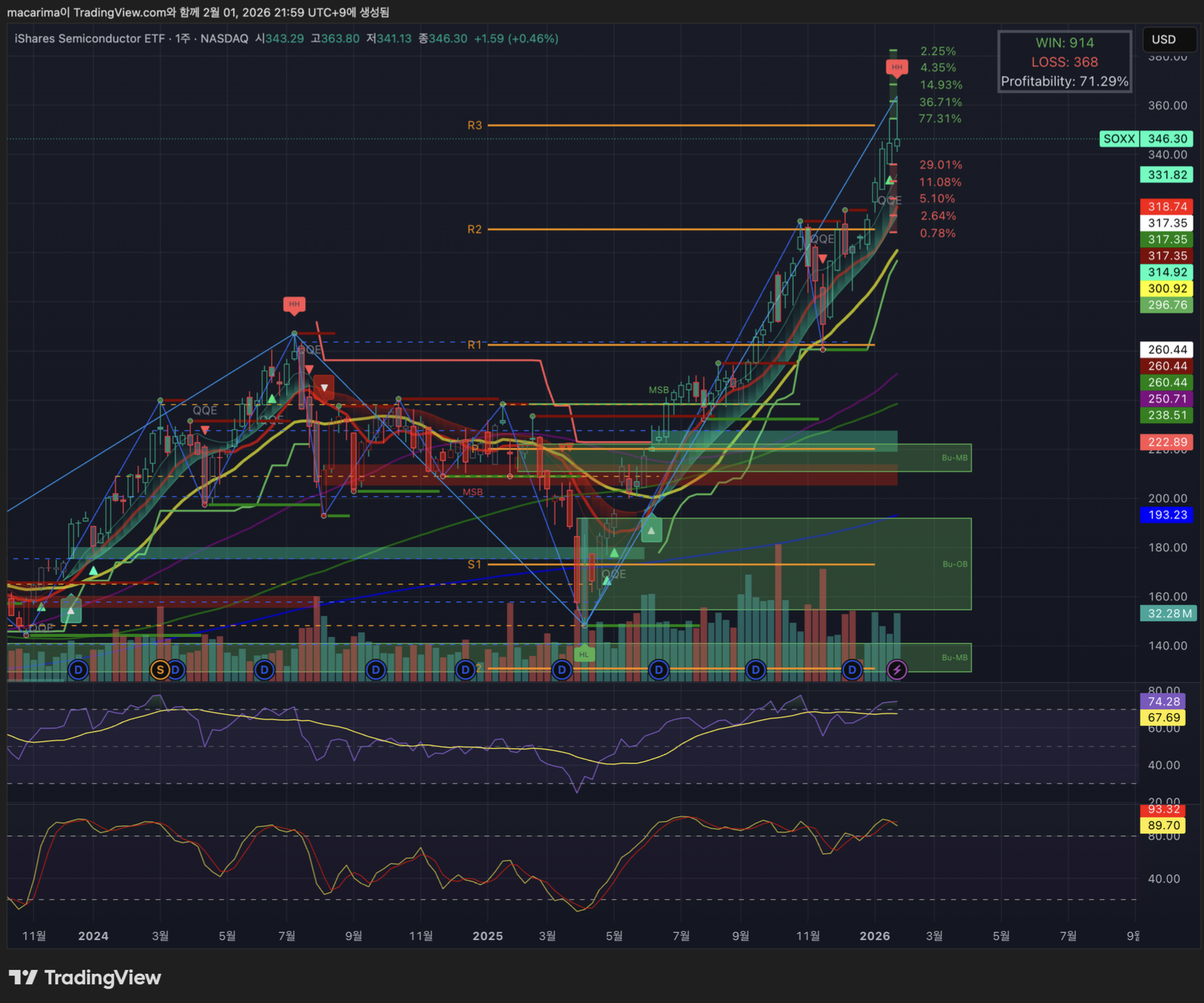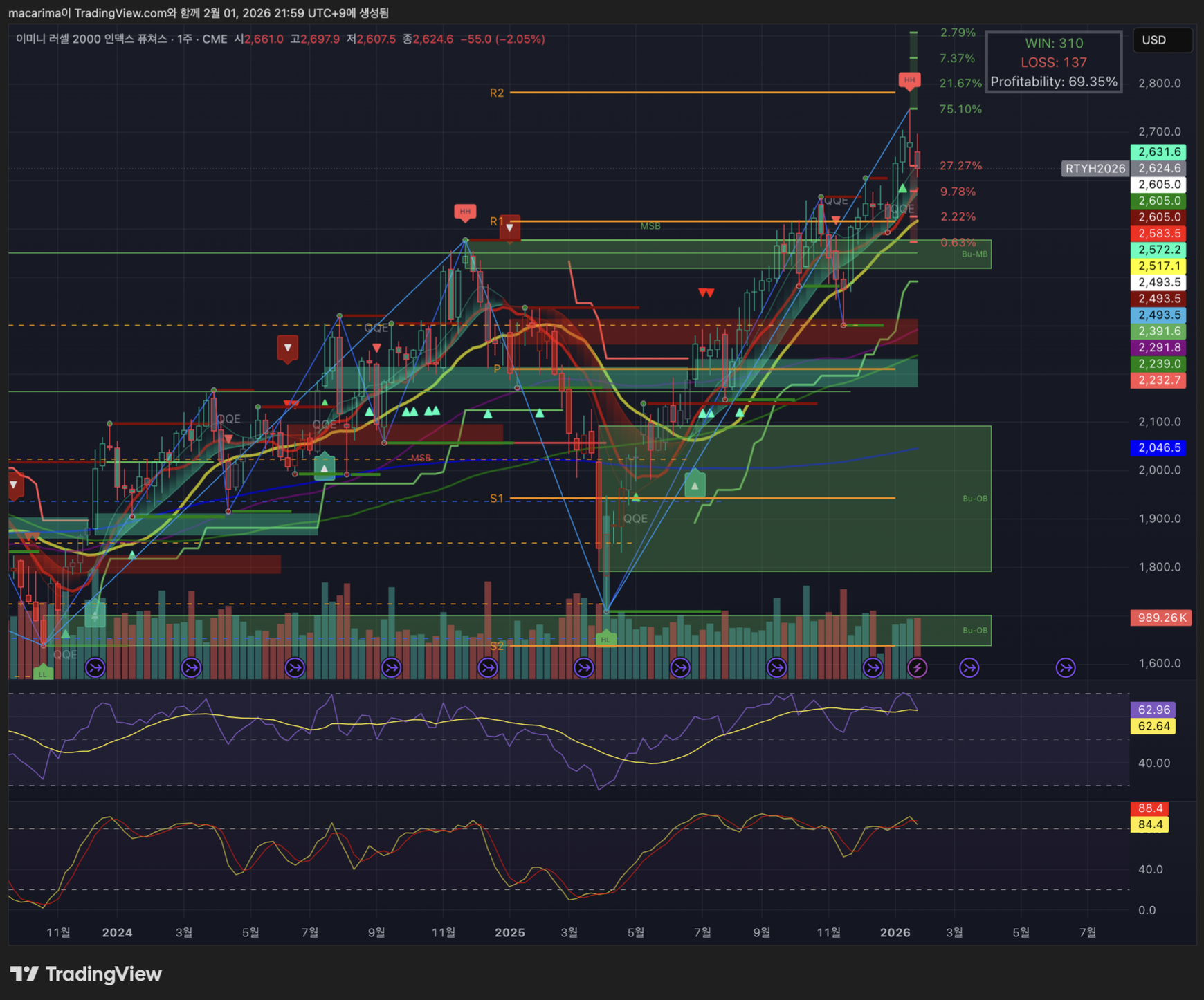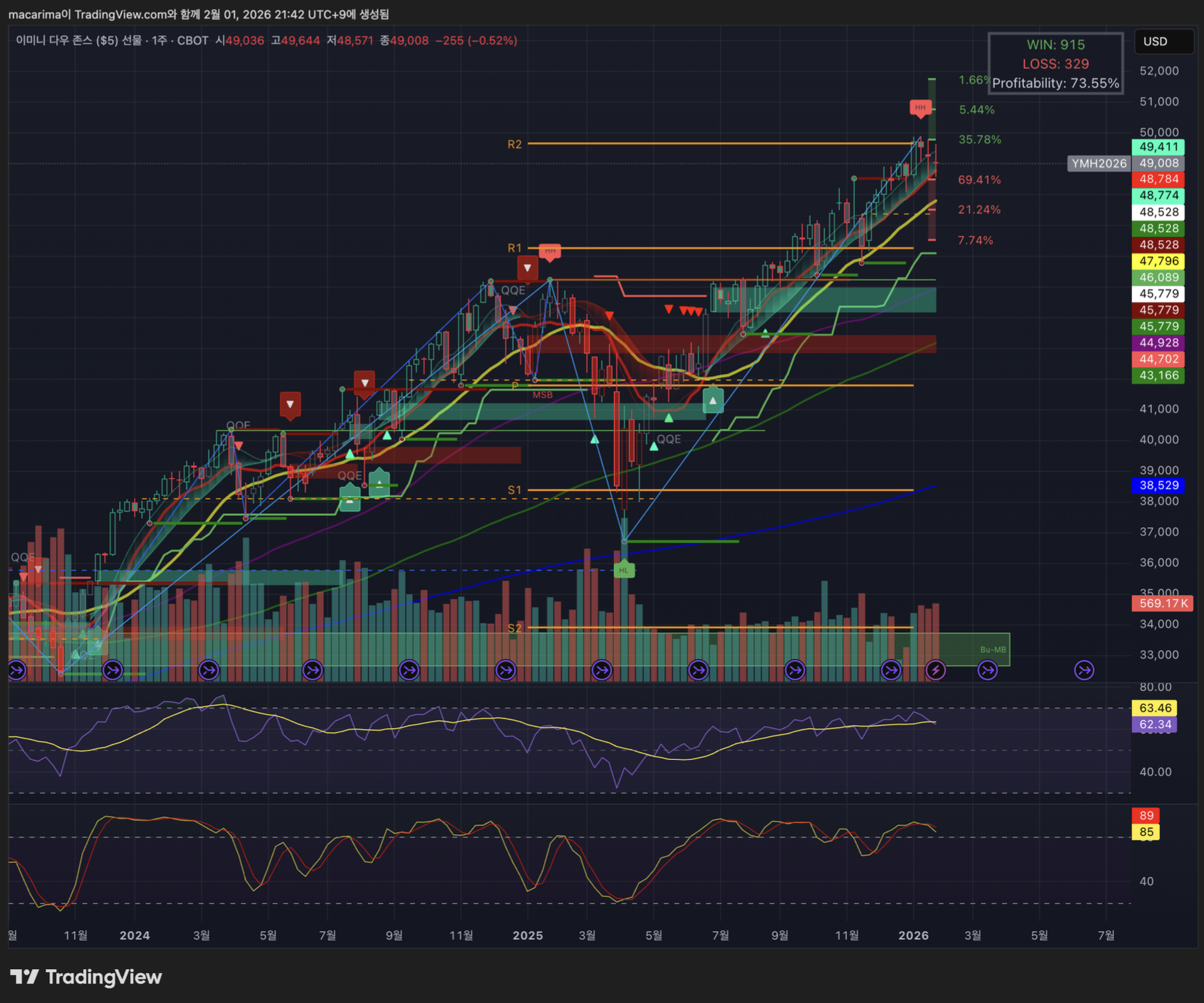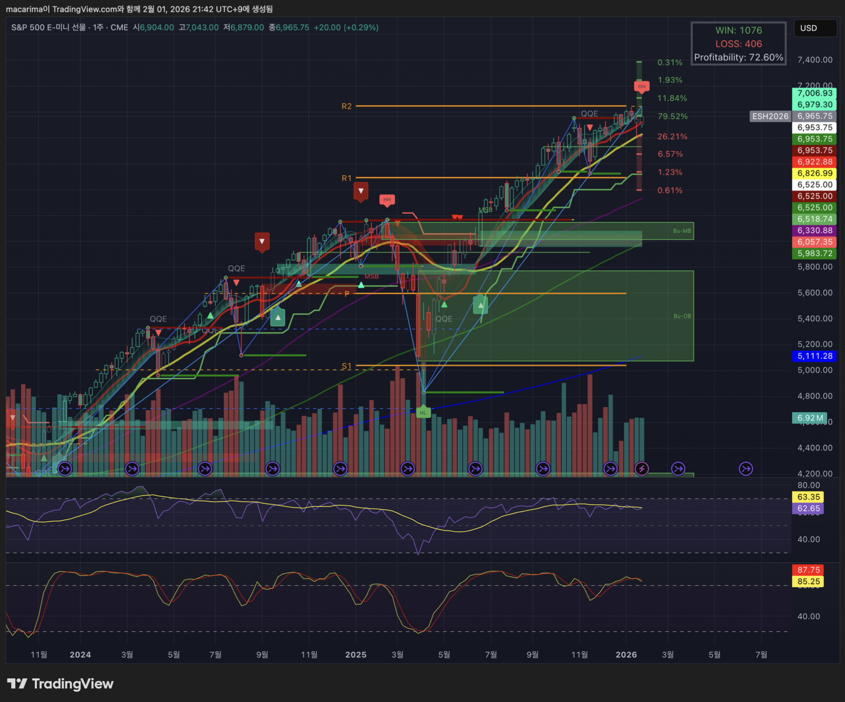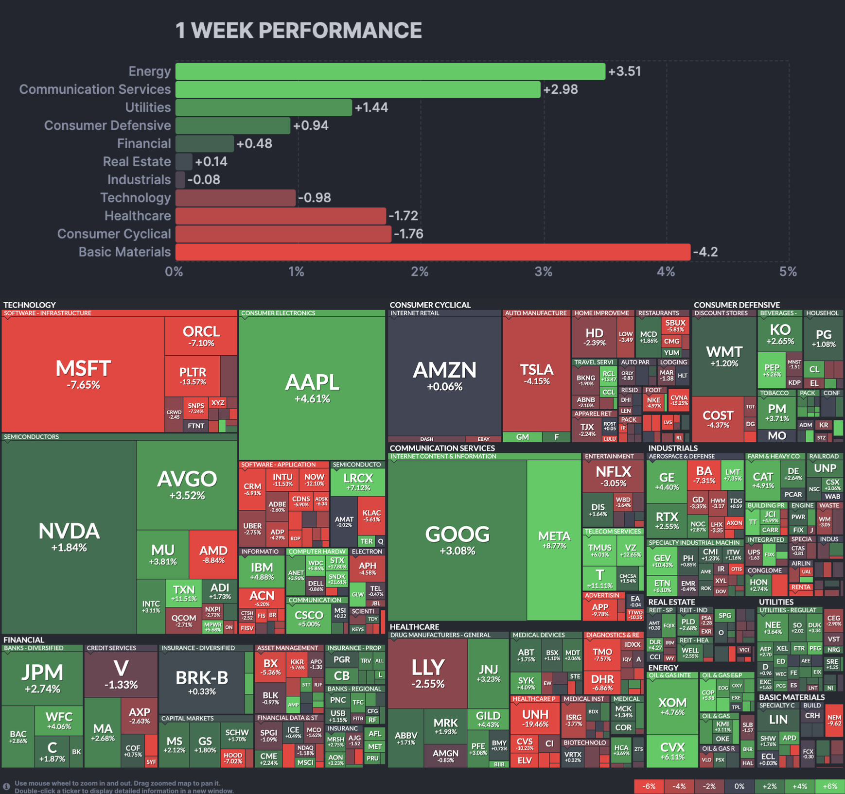 계속 섹터 로테이션이 발생함과 동시에 그간 많이 오른 종목들은 크게 빠지고, 지난주에 하락한 종목들은 반등하는 장세가 되었습니다. 마이크로소프트의 어닝 실망감으로 인한 충격으로 AI 소프트웨어들이 큰 폭의 조정을 받았습니다. AI가 적게 관여된 애플이 큰 상승을 보였고, 그 외의 AI 하드웨어 종목들은 TXN, ASML, LRCX, IBM 등의 관련주 어닝 서프라이즈로 인해 상승했습니다. 그러나 새로 지명된 연준 의장 후보가 매파 성향을 띄는 것에 대해 시장이 우려하며 금, 은, 백금 등을 비롯한 원자재들이 폭락하면서 선물 시장에 큰 하락이 발생했고, 기술주 등도 이에 동조하여 추가 하락했습니다. 특히 지난주 많이 올랐던 원자재 섹터가 이번주에는 매크로 이슈로 인해 큰 폭으로 조정 받았습니다. 헬스케어 섹터도 UNH로 인해 조정 받는 분위기.