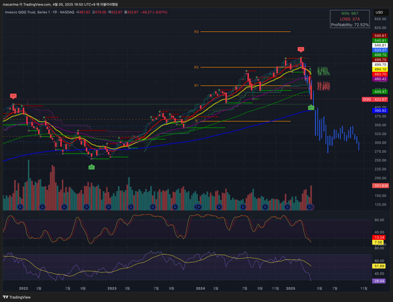 지난주와 마찬가지로 나스닥100과 S&P500은 20주선을 뚫리는 듯 했으나, 간신히 반등하여 10주선 지지. 다우존스도 10주선 지지했습니다만, 결과적으로는 3대 지수는 횡보했습니다.