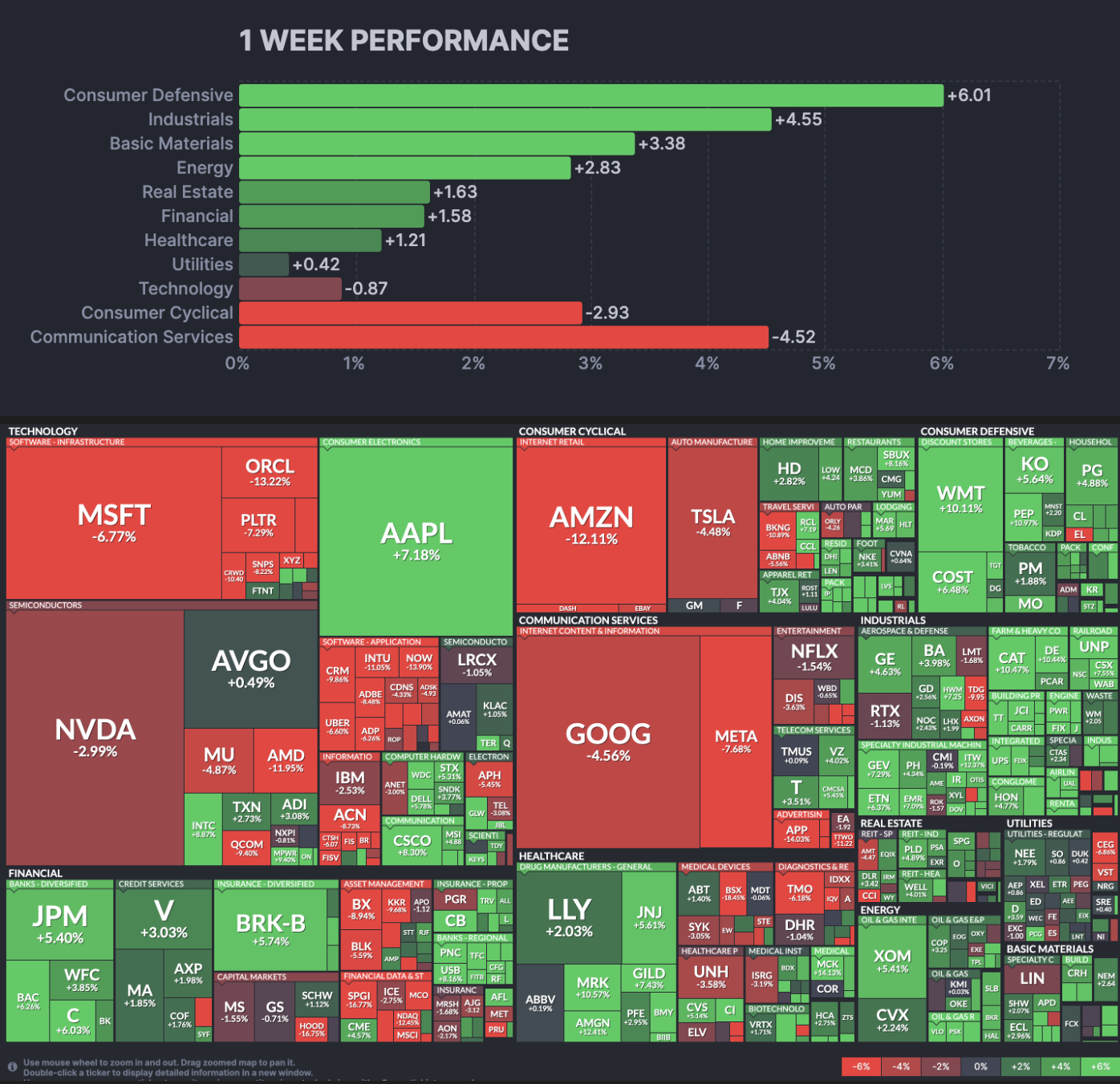 지난주에 이어서 여전히 AI s/w 섹터가 추가 조정을 받으며 나스닥의 하락을 견인했습니다. PLTR도 견조한 실적을 발표했으나, 워낙에 고밸류라서 조정을 받은 것을 보입니다. 구글과 아마존은 MSFT와 마찬가지로 좋은 매출 실적에도 불구하고 CapEx 문제가 노출되면서 주가 조정을 받았습니다. 이에 클라우딩 컴퓨팅에 연관된 섹터나 과한 CapEx로 주가가 하락한 종목들의 추가적인 하락이 발생했습니다. 지난주와 마찬가지로 AI에 가장 적게 관여된 것으로 보이는 애플이 나스닥 섹터 방어주의 역할을 하면서 7% 큰 상승을 보였습니다.