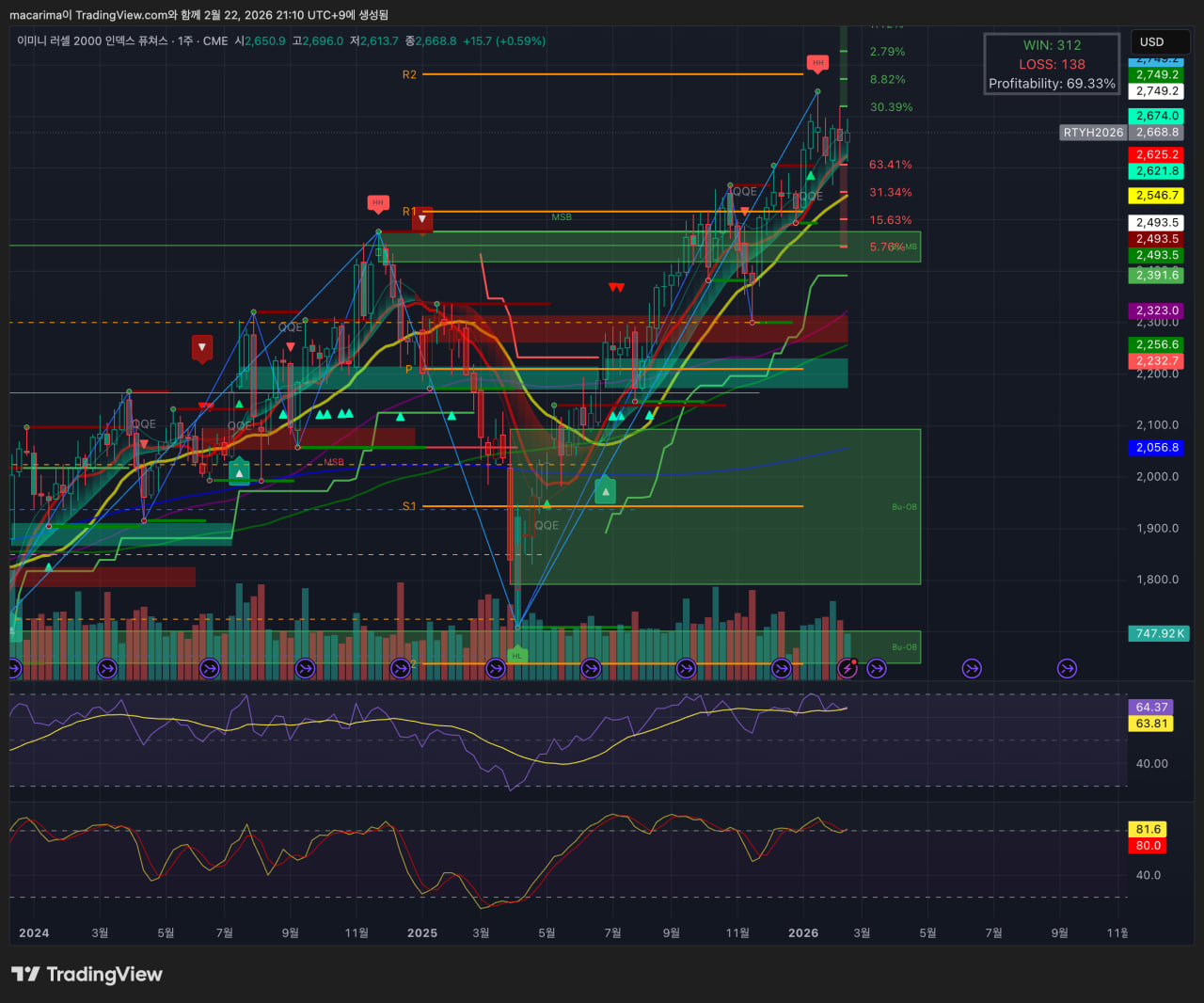 러셀 2k는 10주선 지지하며 강보합, 그러나 이전 주보다 고점은 낮아진 모습.