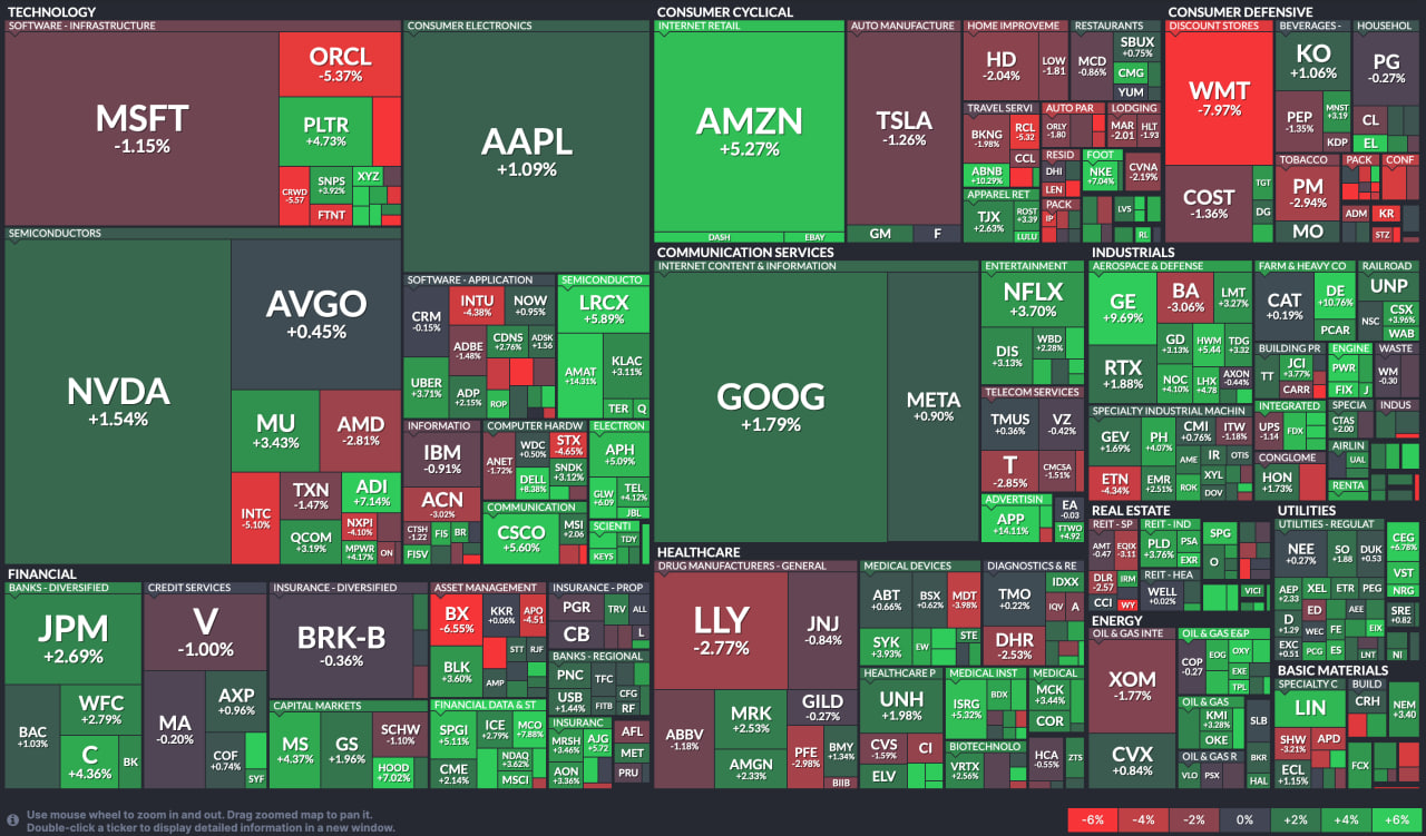 M7들은 저점을 지지하며 반등하였고, 낙폭과대 종목에 저가 유입이 보이는 와중에 여전히 마소는 약한 모습을 보였습니다. 그간 큰 상승을 보였던 월마트가 큰 폭의 하락을 보였는데, 이 영향으로 인해 방어주 섹터를 제외한 나머지 섹터들은 대체로 상승하는 모습을 보였습니다.