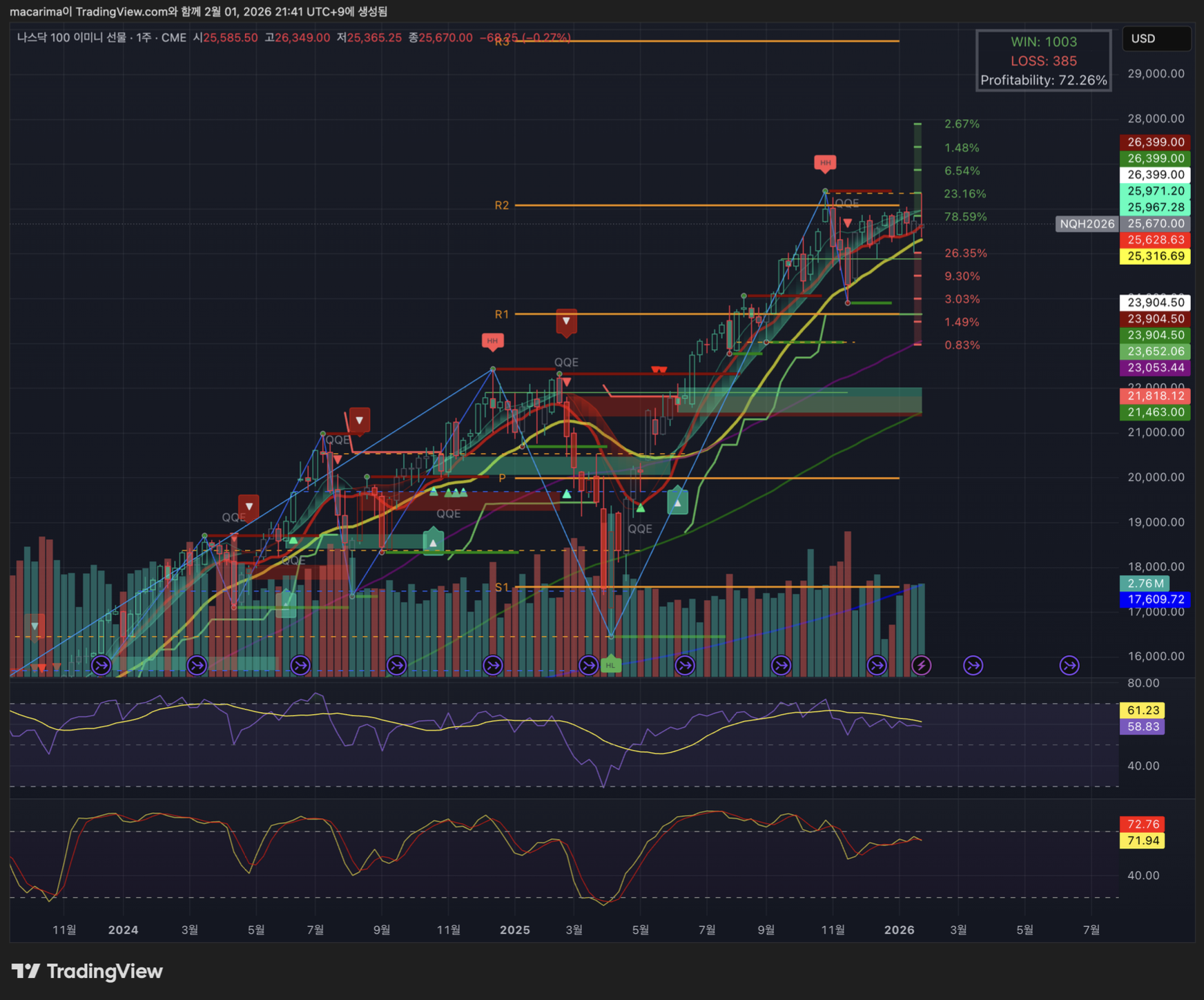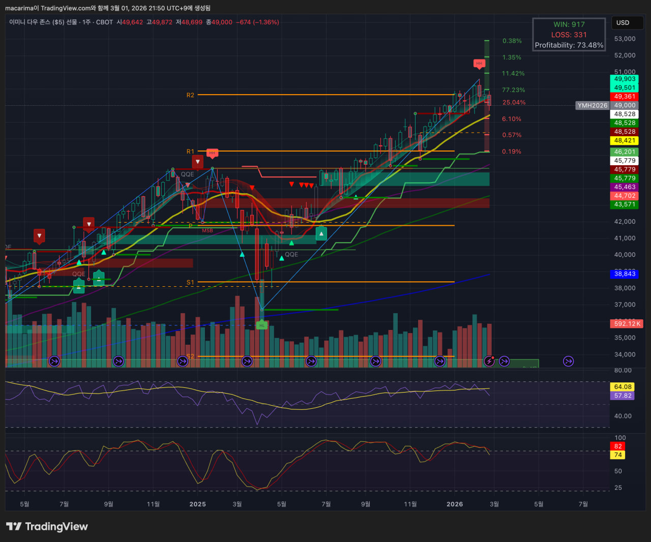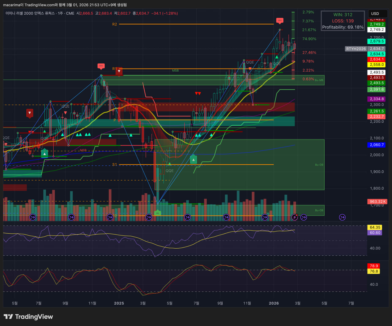 러셀 2k는 10주선 지지는 했으나, 고점은 지난주보다 빠지는... 다이버전스 형성 중입니다.