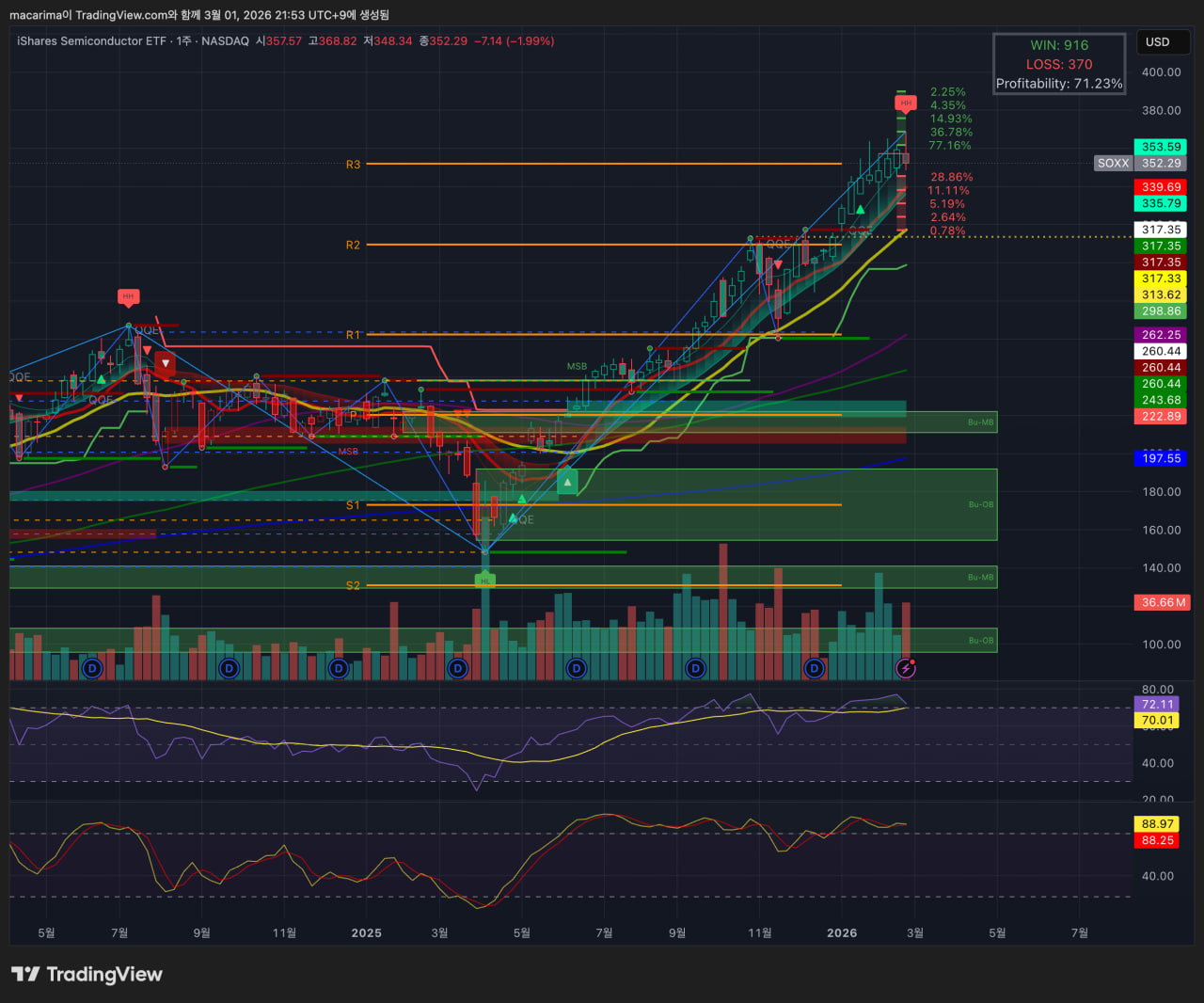 나스닥100은 10, 20주선 밑에서 박스권 하단으루 내려갔다가 간신히 금요일 저가 매수세로 버팀. S&P500은 20주선 지지 + 10주선 저항, 다우는 10주선 하방 돌파하며 음봉 발생. 다우까지 서서히 내려오면서 점차 3대 지수들이 하방세가 세지는 느낌입니다.
